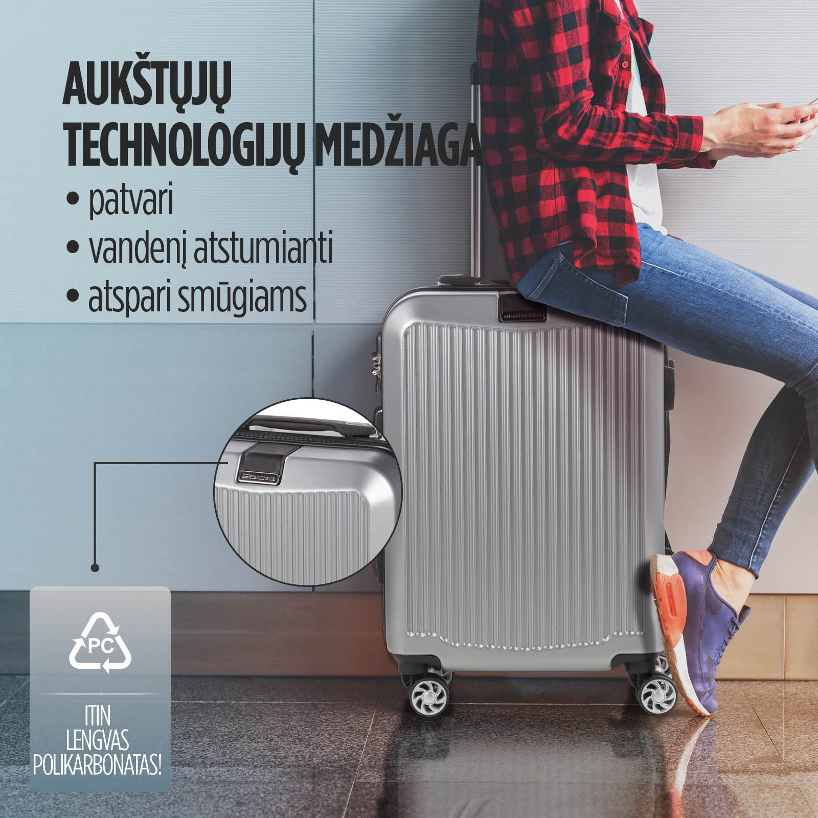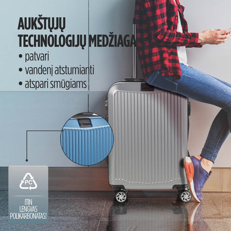 - Lagaminas pagamintas iš aukštos kokybės polikarbonato. Medžiaga yra atspari smūgiams, itin tvirta ir patvari, tačiau itin lengva.