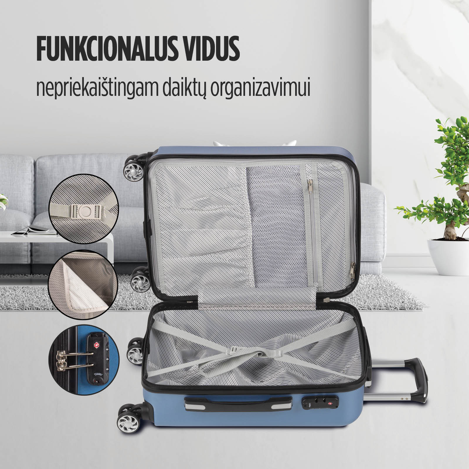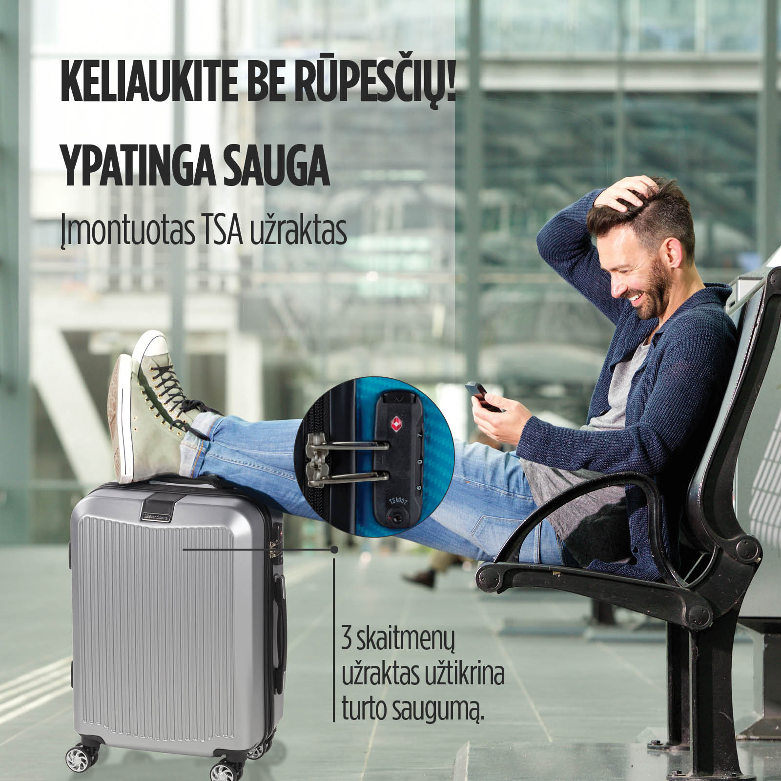 - TSA užraktas, skirtas saugiai užrakinti lagaminą.