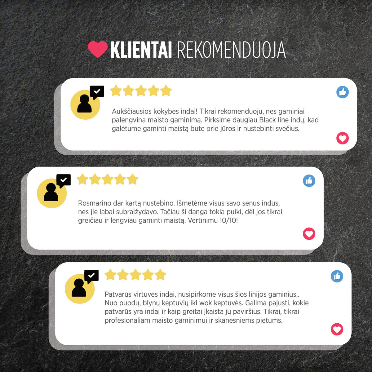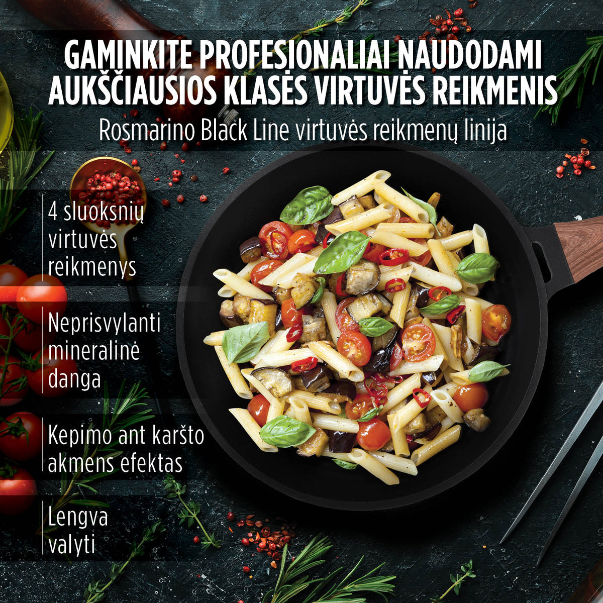 Black Line keptuvė priklauso aukščiausios kokybės virtuvės reikmenų grupei - ji padengta naujoviška, pagrįsta įmantriomis technologijomis Vokietijoje sukurta šiurkščia mineraline danga. Dėl nepridegančios mineralinės dangos gaminimas ir kepimas vyksta natūraliai, naudojant nedaug riebalų. Taip maiste išlieka visi svarbiausi vitaminai ir mineralai, kurių reikia sveikam gyvenimo būdui. Tinka naudoti ant visų viryklių, įskaitant indukcines, lengva valyti, nes galima plauti indaplovėje. Visi Black Line asortimento puodai ir keptuvės yra daugiasluoksniai, todėl jie yra ypač atsparūs ir tarnaus ilgai.