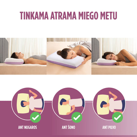 - Tinka visoms miego padėtims: ant nugaros, šono, pilvo. Tinka tiems, kurie miegodami dažnai vartosi.