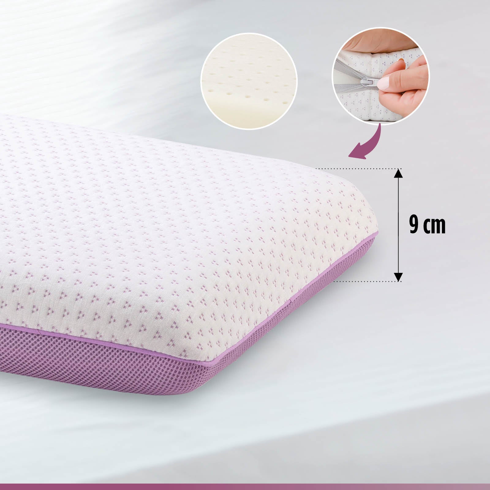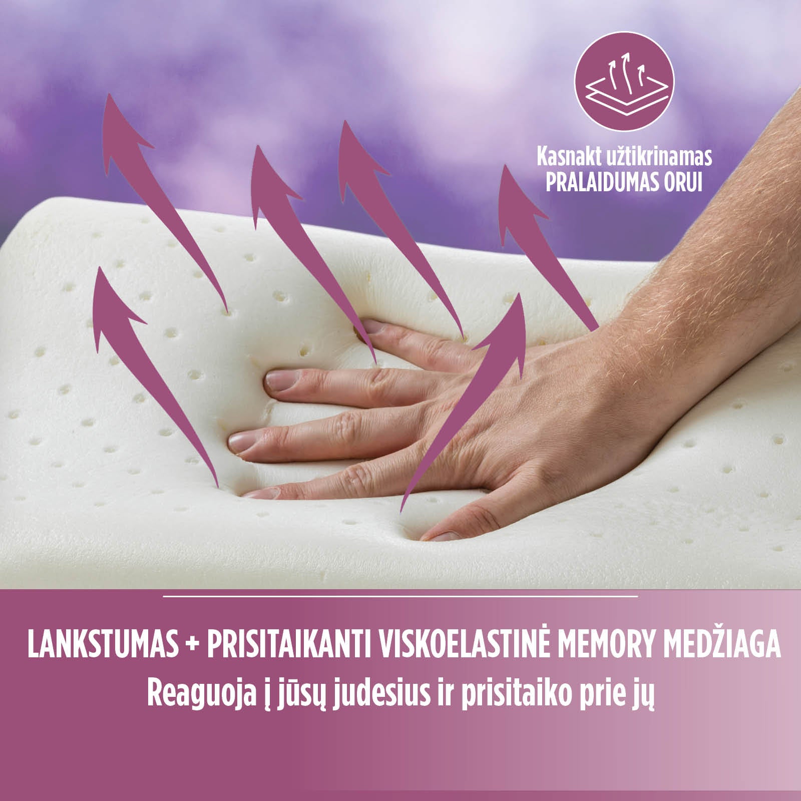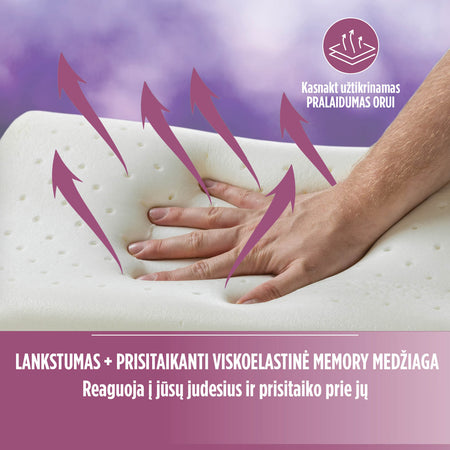 Lavender Memory klasikinė pagalvė su Memory putomis siūlo geriausią sprendimą miegui be skausmo: universali pagalvės forma ir Memory putos prisitaiko prie jūsų kaklo ir galvos. Raminantis levandų kvapas gerina miego kokybę, todėl ši pagalvė tinka tiems, kurie kenčia nuo nemigos. Puikiai tinka mėgstantiems įvairias miego padėtis: ant nugaros, ant pilvo ir ant šono. Papildomas 3D AirMesh oro modulis užtikrina oro cirkuliaciją.