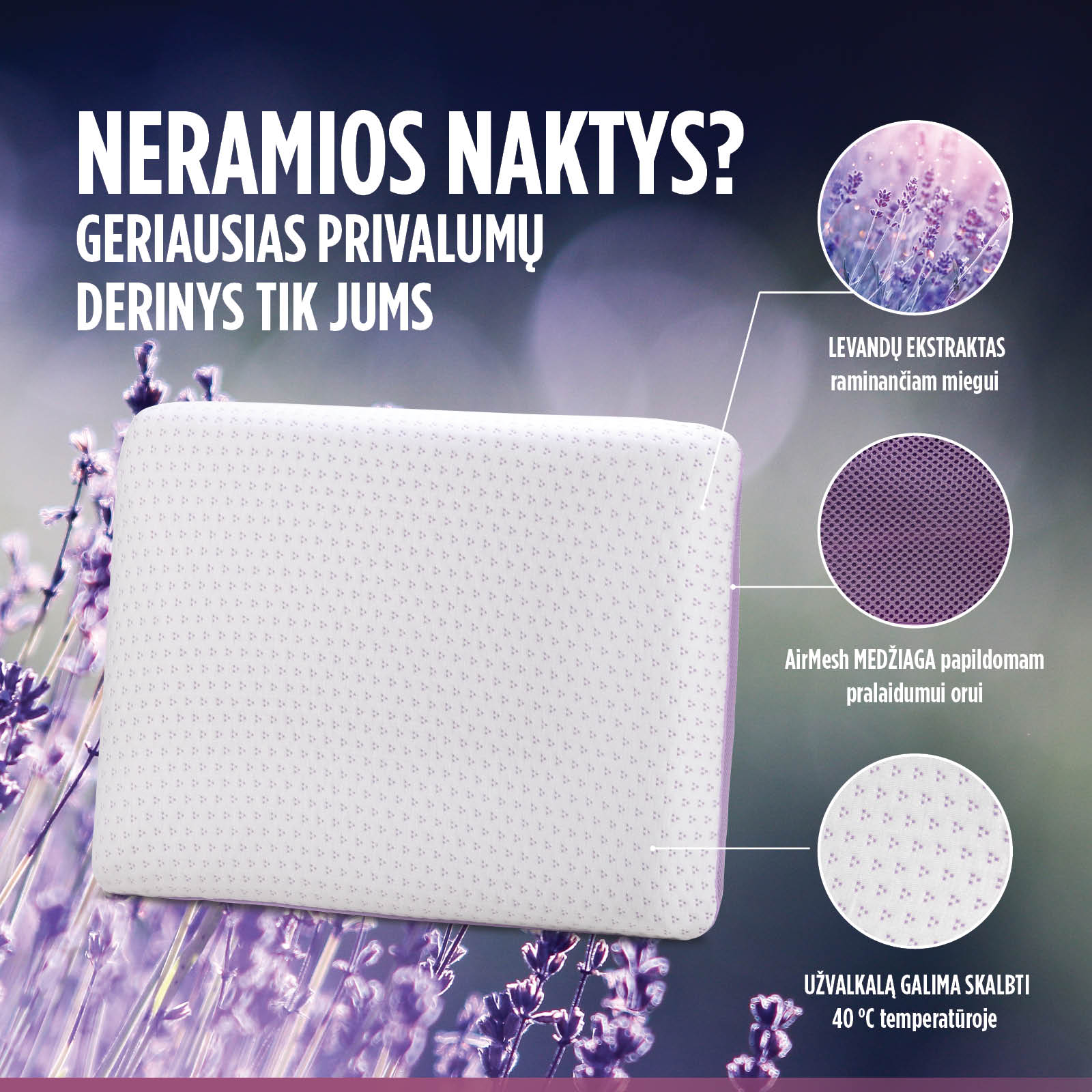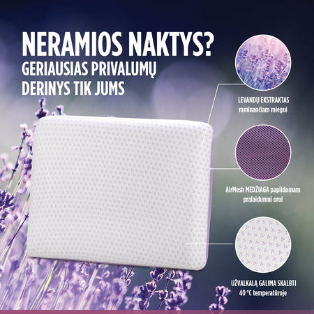 Raminantis levandų kvapas gerina miego kokybę, todėl ši pagalvė tinka tiems, kurie kenčia nuo nemigos ir išsekimo. Natūralios levandos yra žinomos dėl savo teigiamo poveikio – mažina stresą, šalina nerimą ir teigiamai veikia odą.