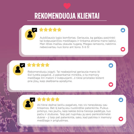 Lavender Memory siūlo geriausią sprendimą miegui be skausmo: universali pagalvės forma ir Memory putos prisitaiko prie jūsų kaklo ir galvos. Visą naktį jūsų kaklas bus tinkamoje padėtyje, miegosite ramiai ir rytais pabusite be skausmo.