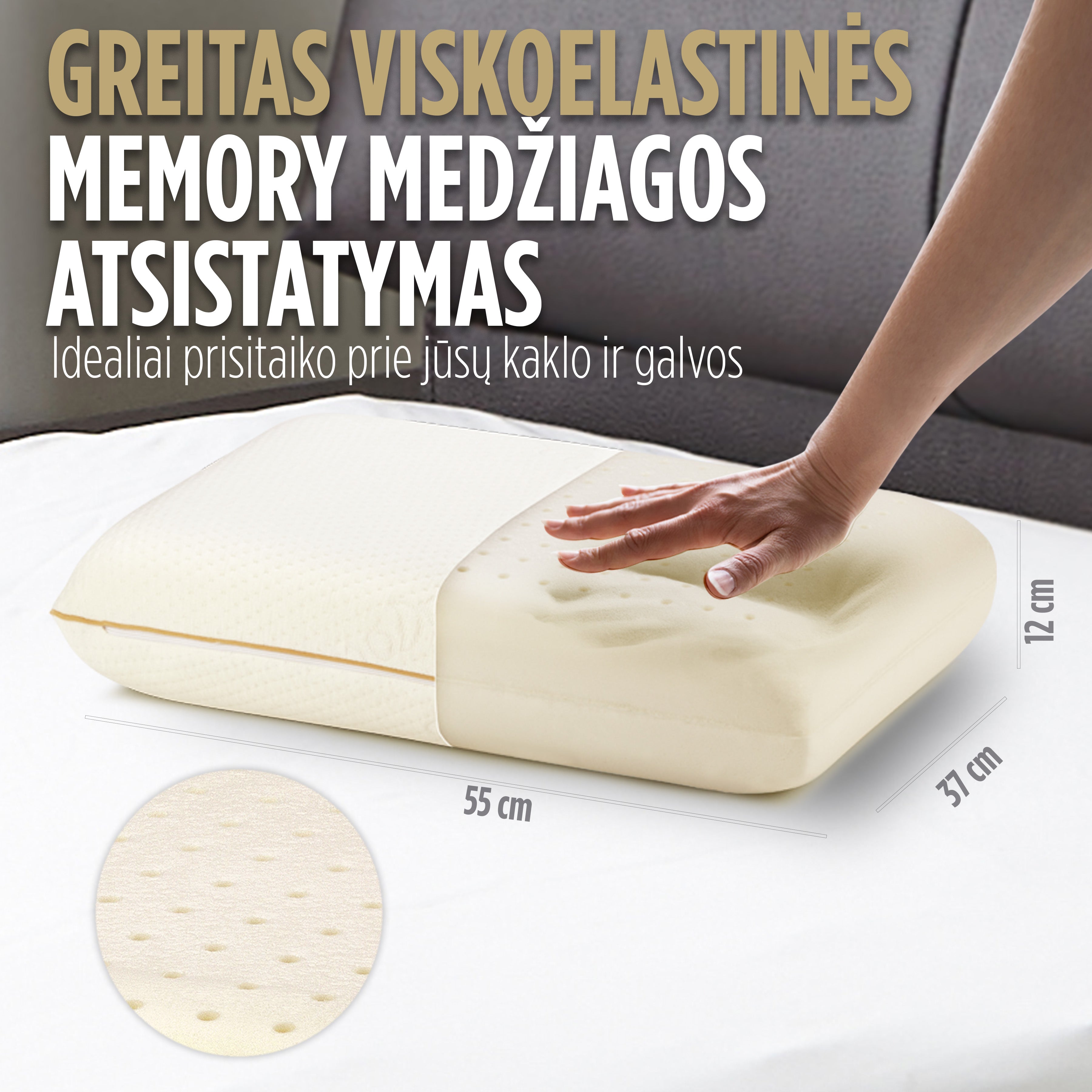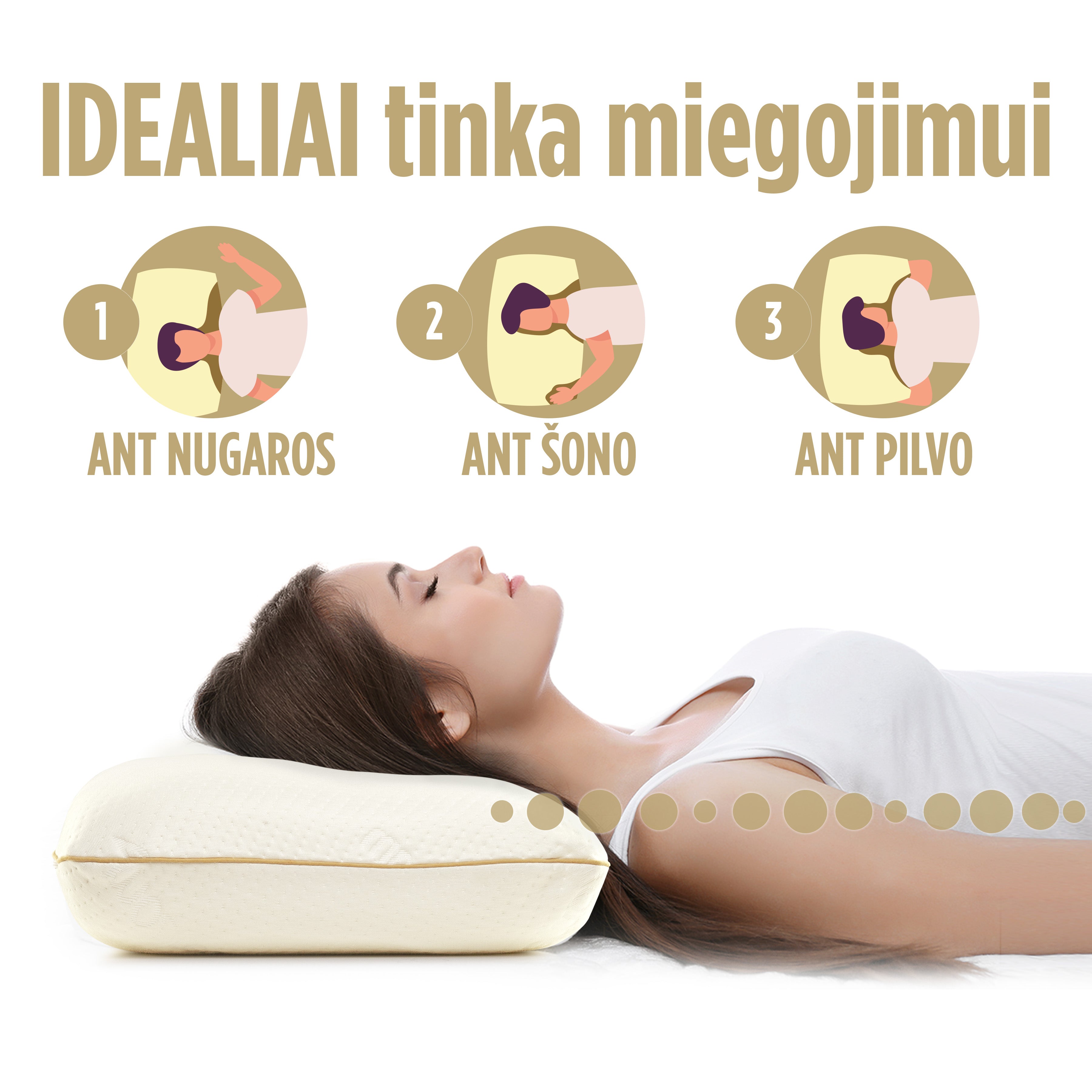 - Užtikrina taisyklingą kaklo padėtį visose miegojimo padėtyse.