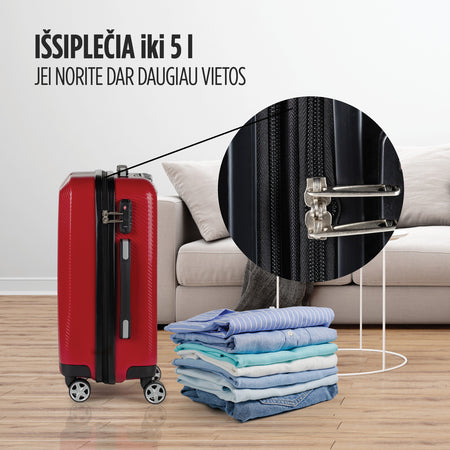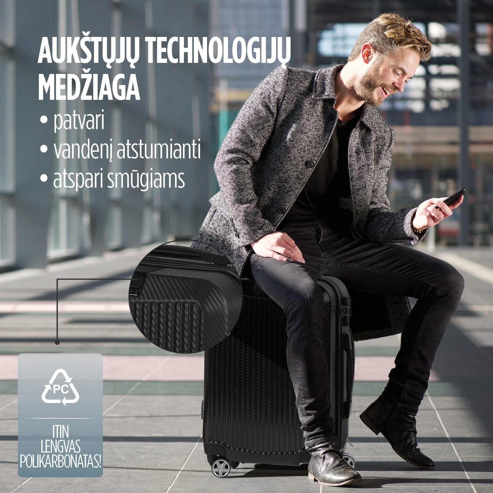 Lagaminas kietu korpusu Scandinavia Carbon Series atstovauja naujos kartos lagaminams. 60 litrų talpos lagaminas yra geriausias pasirinkimas ilgesnėms kelionėms ir puikiai tinka tiems, kas mėgsta tvarkingai laikyti savo daiktus. Aukštųjų technologijų polikarbonatas yra atsparus vandeniui, smūgiams, įbrėžimams bei yra itin tvirtas ir patvarus. 4 dvigubi 360° besisukantys ratukai, teleskopinė rankena ir TSA užraktas neabejotinai leis keliauti be jokių rūpesčių.