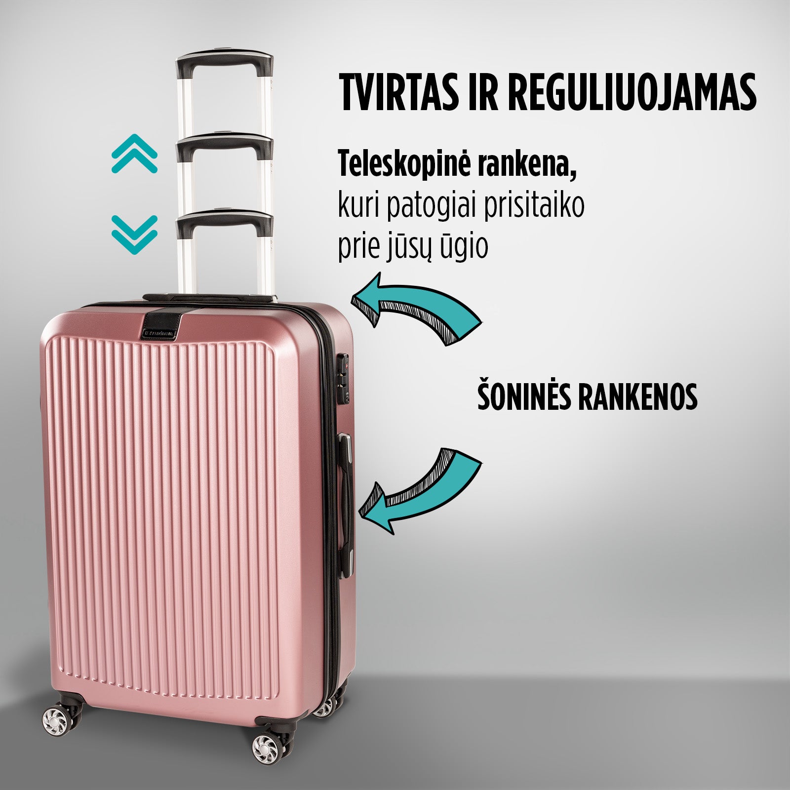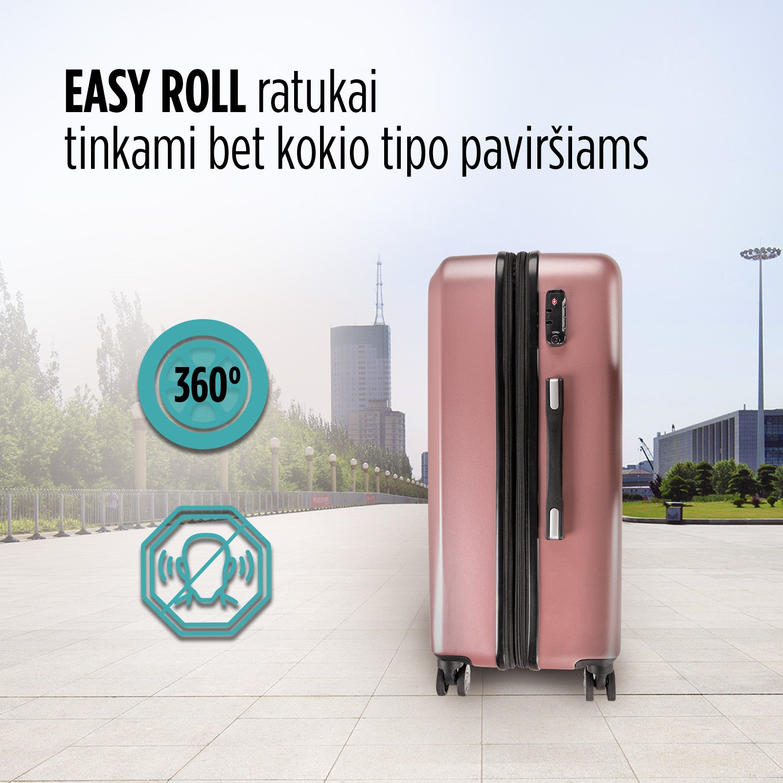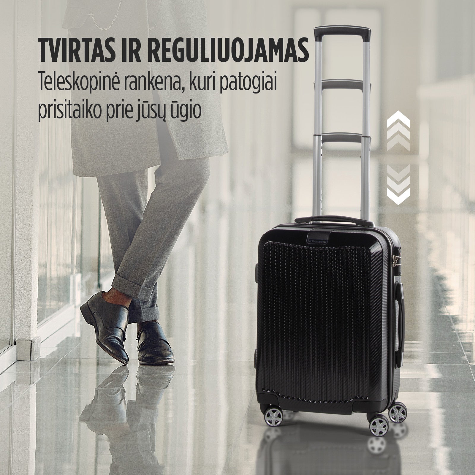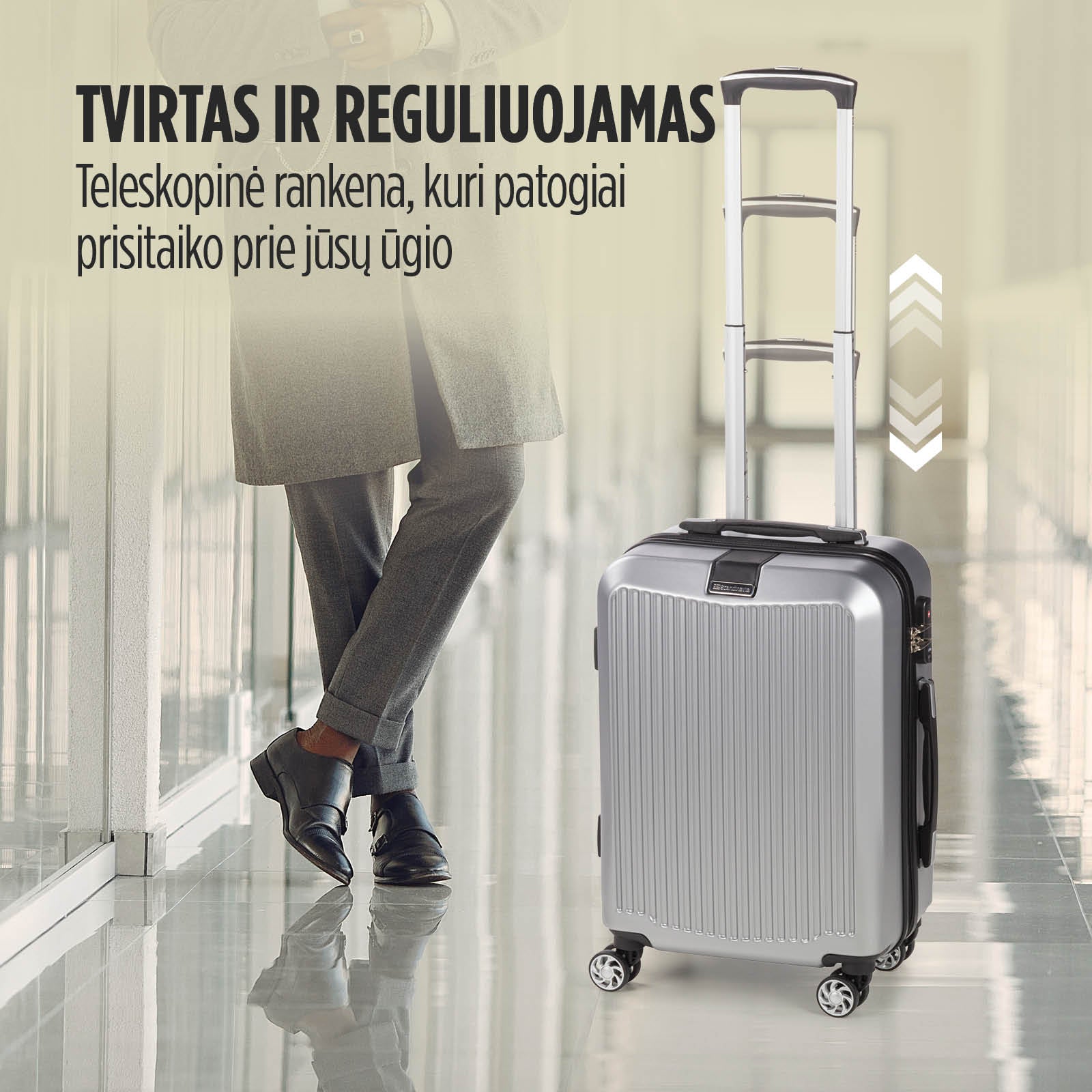 4 dvigubi 360° besisukantys ratukai leidžia tyliai ir saugiai riedėti bet kuria kryptimi, neužstrigdami. Jo išskirtinis praktiškumas atsispindi reguliuojamoje teleskopinėje rankenoje, kuri leidžia lengvai transportuoti net ir sunkiausią bagažą. Lengvai sureguliuokite jį į reikiamą aukštį.