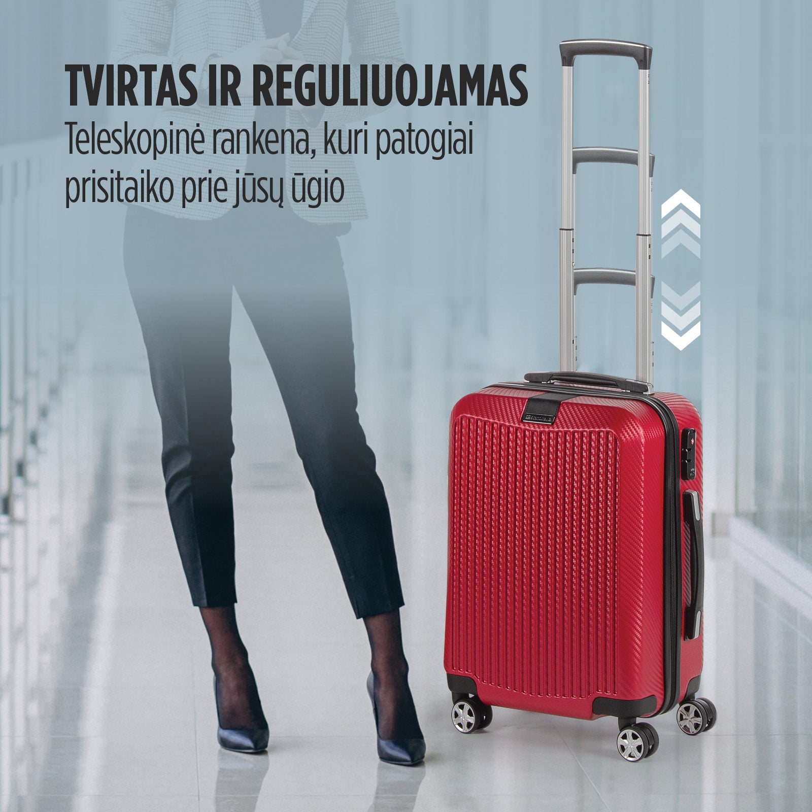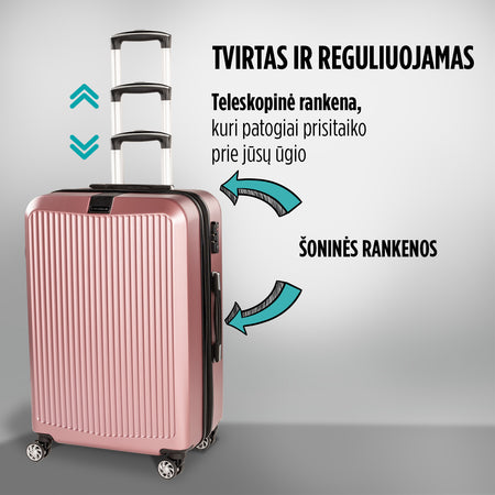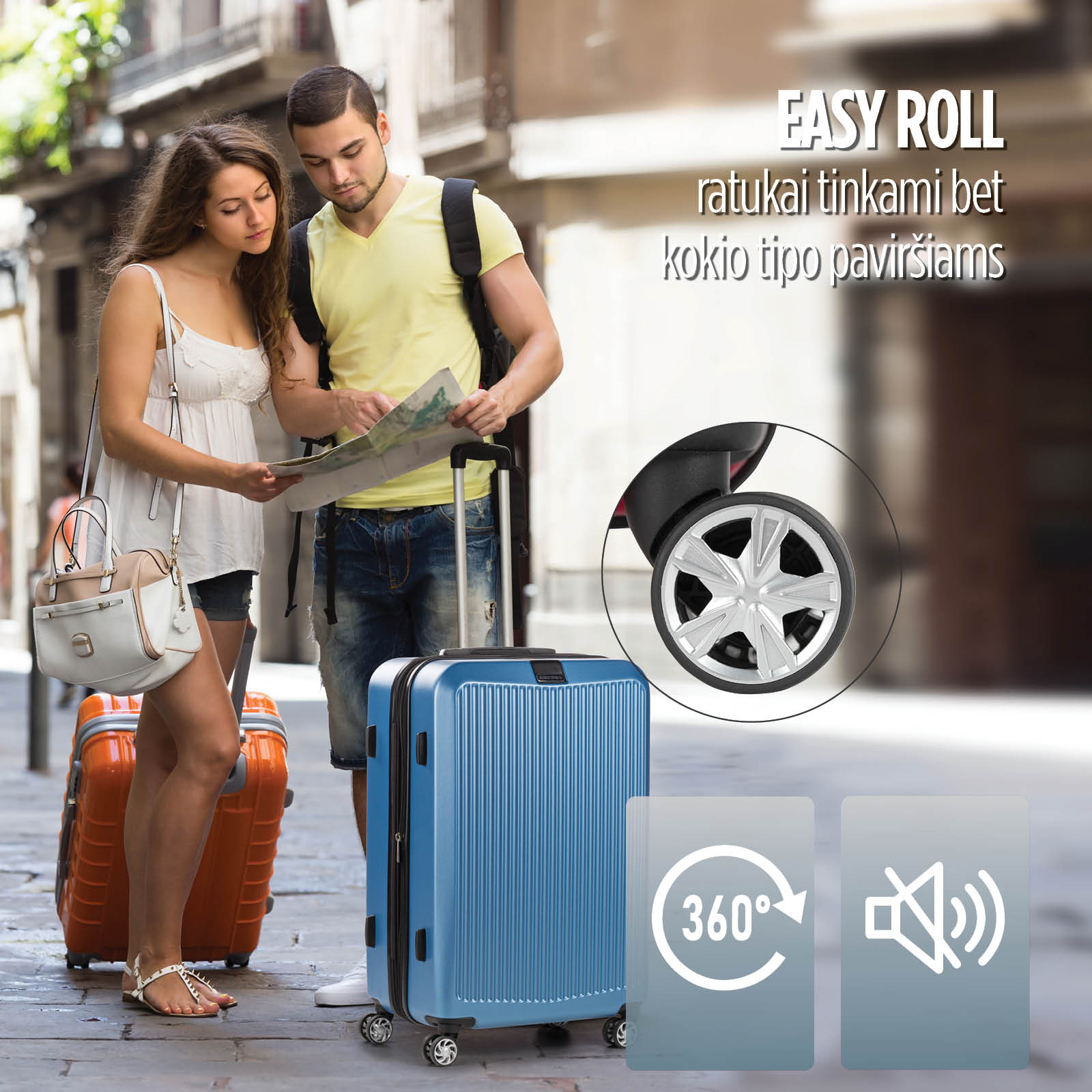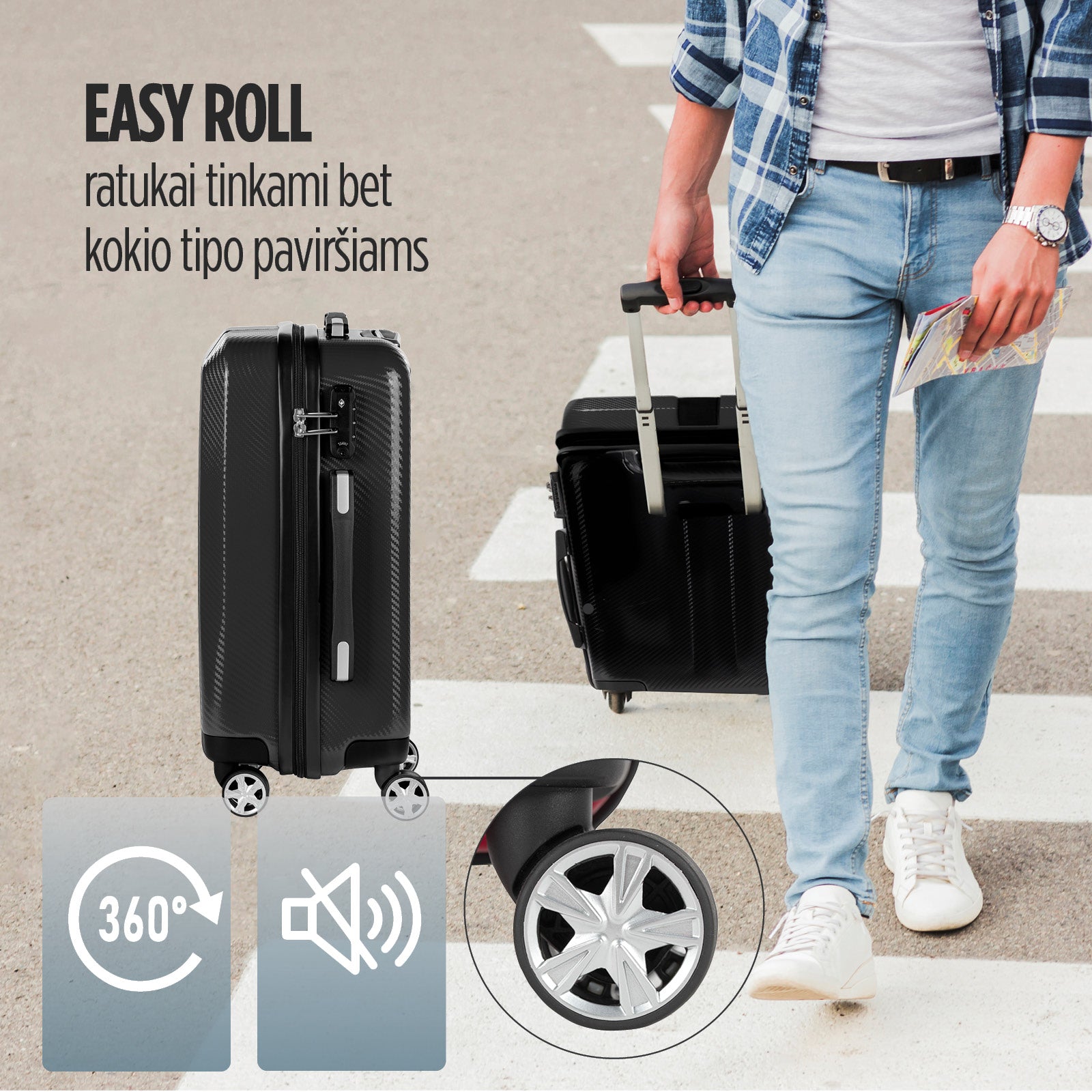 4 dvigubi 360° besisukantys ratukai leidžia tyliai ir saugiai riedėti bet kuria kryptimi, neužstrigdami. Jo išskirtinis praktiškumas atsispindi reguliuojamoje teleskopinėje rankenoje, kuri leidžia lengvai transportuoti net ir sunkiausią bagažą. Lengvai sureguliuokite jį į reikiamą aukštį.