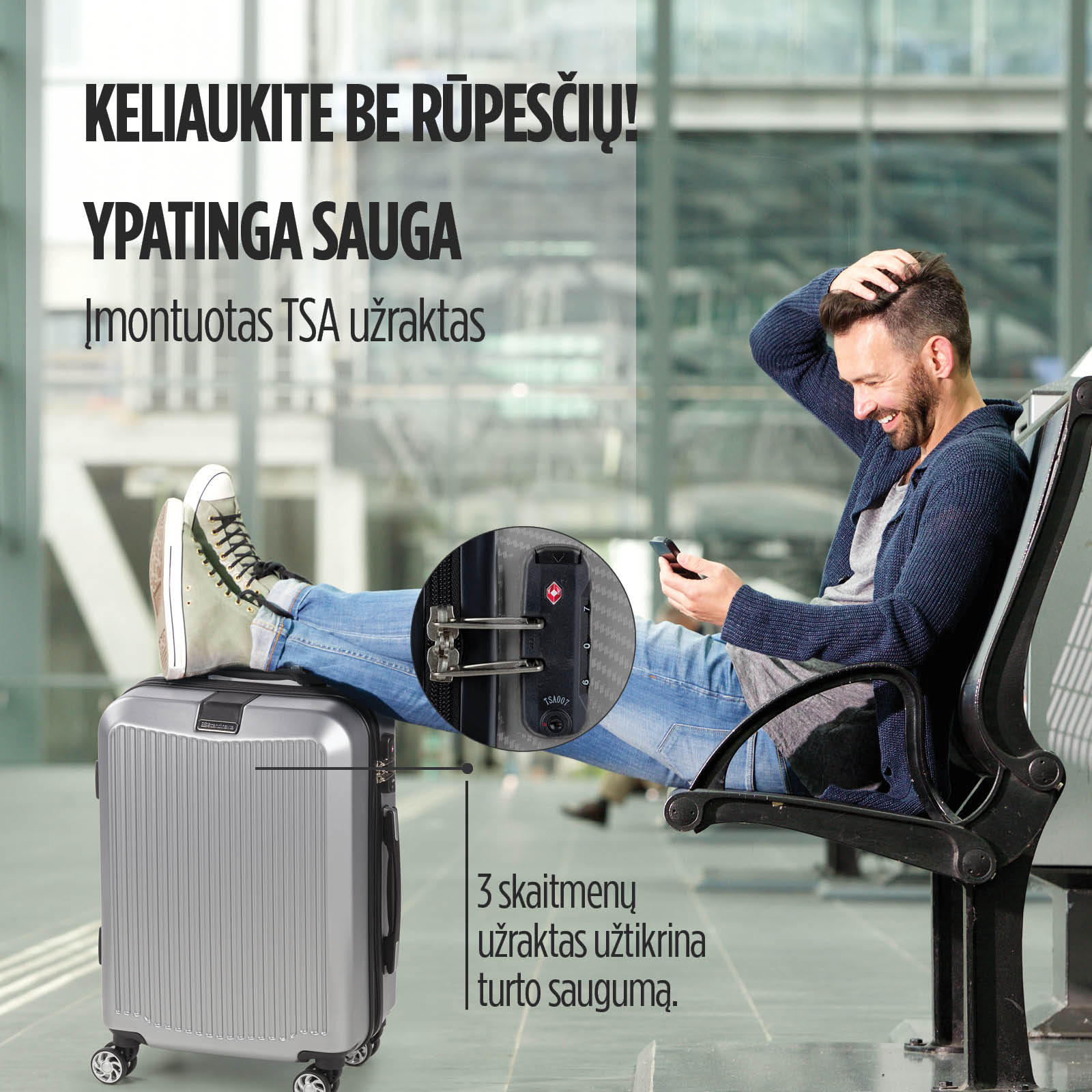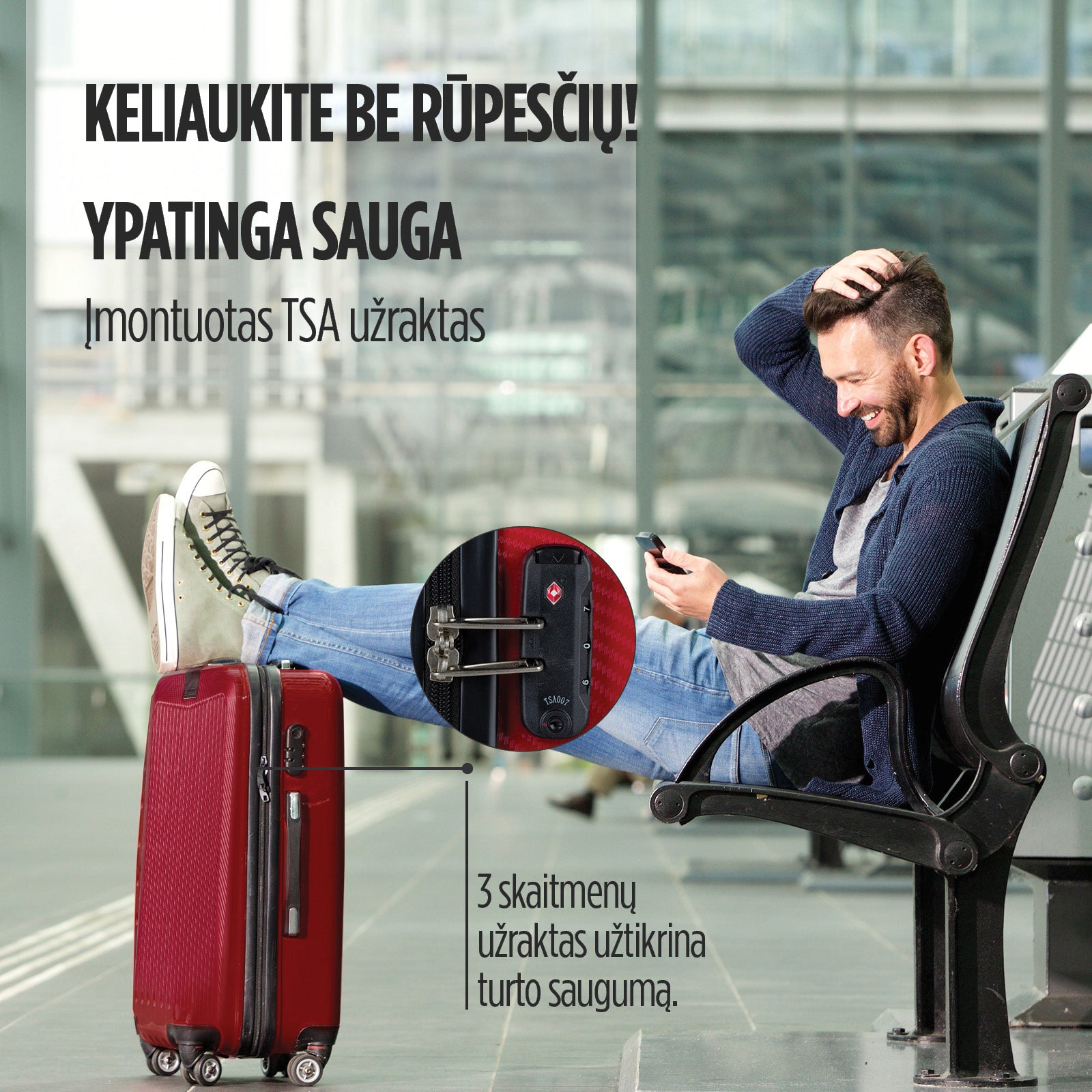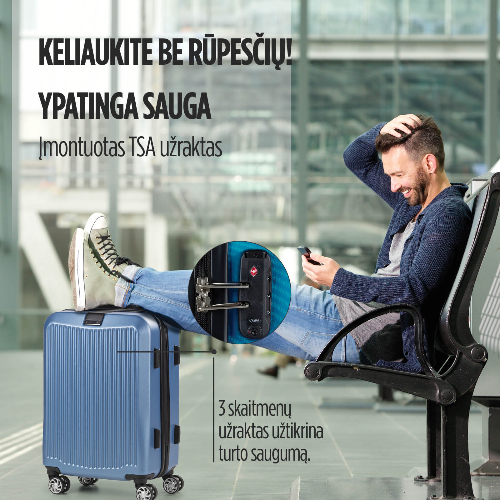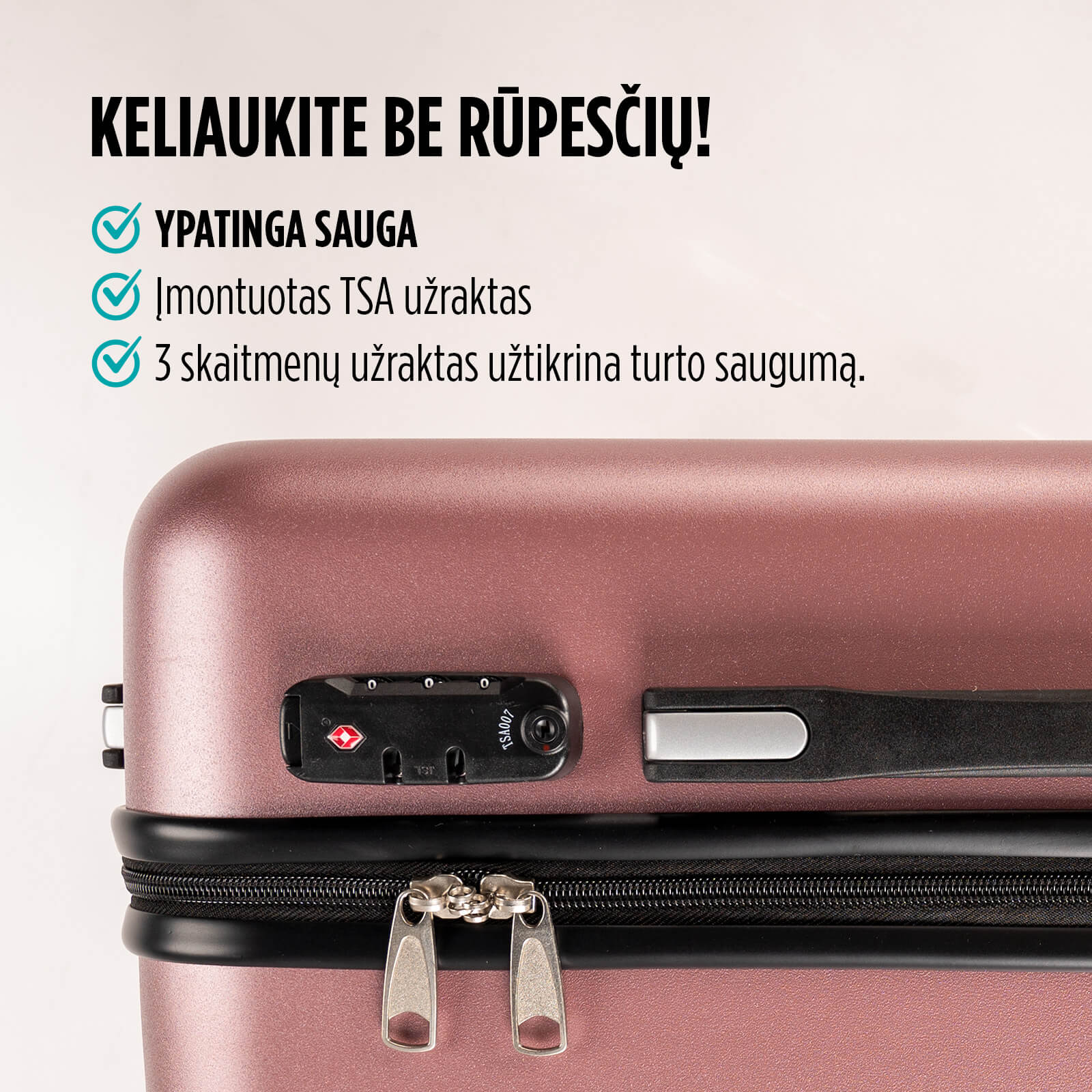 Integruotas 3 skaitmenų TSA užraktas užtikrina saugų laikymą ir dar daugiau nerūpestingų atostogų dienų. TSA spyna ypač palengvina keliones į JAV, kur lagaminai per patikrinimą atidaromi specialiu raktu nepažeidžiant spynos.