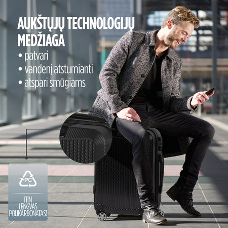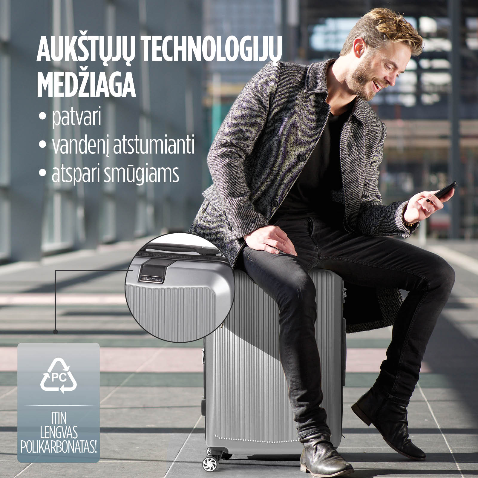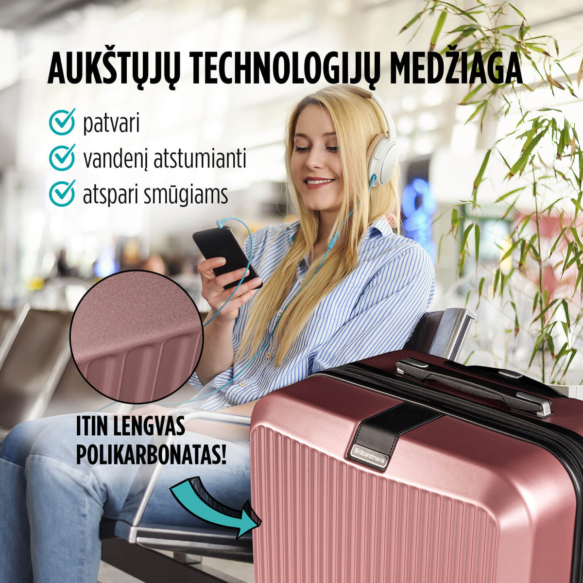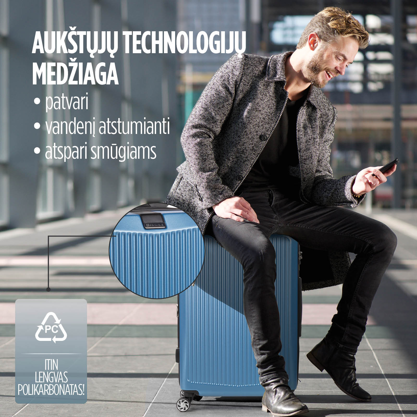 - Lagaminas pagamintas iš aukštos kokybės polikarbonato. Medžiaga yra atspari smūgiams, itin tvirta ir patvari, tačiau itin lengva.