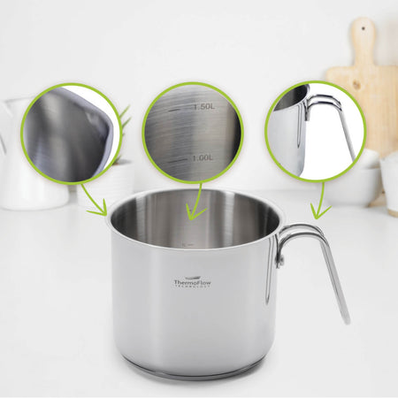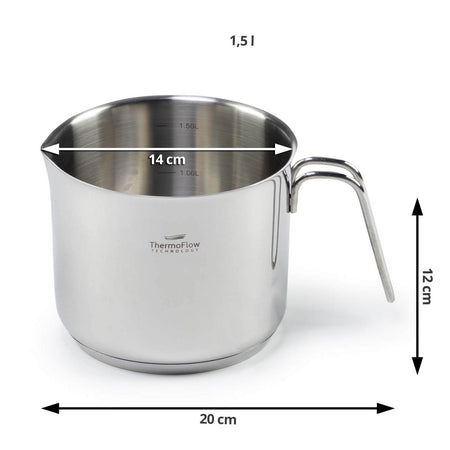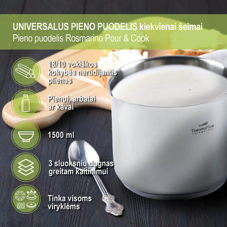 Pour&Cook plieninis pieno puodas yra 14 cm skersmens ir 1.5 l talpos, pagamintas iš nesunaikinamo 18/10 plieno su trisluoksniu pagrindu, kad greitai ir tolygiai įkaistų bei sutrumpintų gaminimo laiką. ThermoFlow technologija užtikrina puikų šilumos paskirstymą visame puodo paviršiuje, todėl maistas ruošiamas tolygiai. Paprastesniam maisto gaminimui puode yra matavimo skalė ir į išorę nukreiptas kraštas, kad būtų lengviau pilti. Tinka naudoti ant visų viryklių, įskaitant indukcines, jį lengva valyti, nes galima plauti indaplovėje.