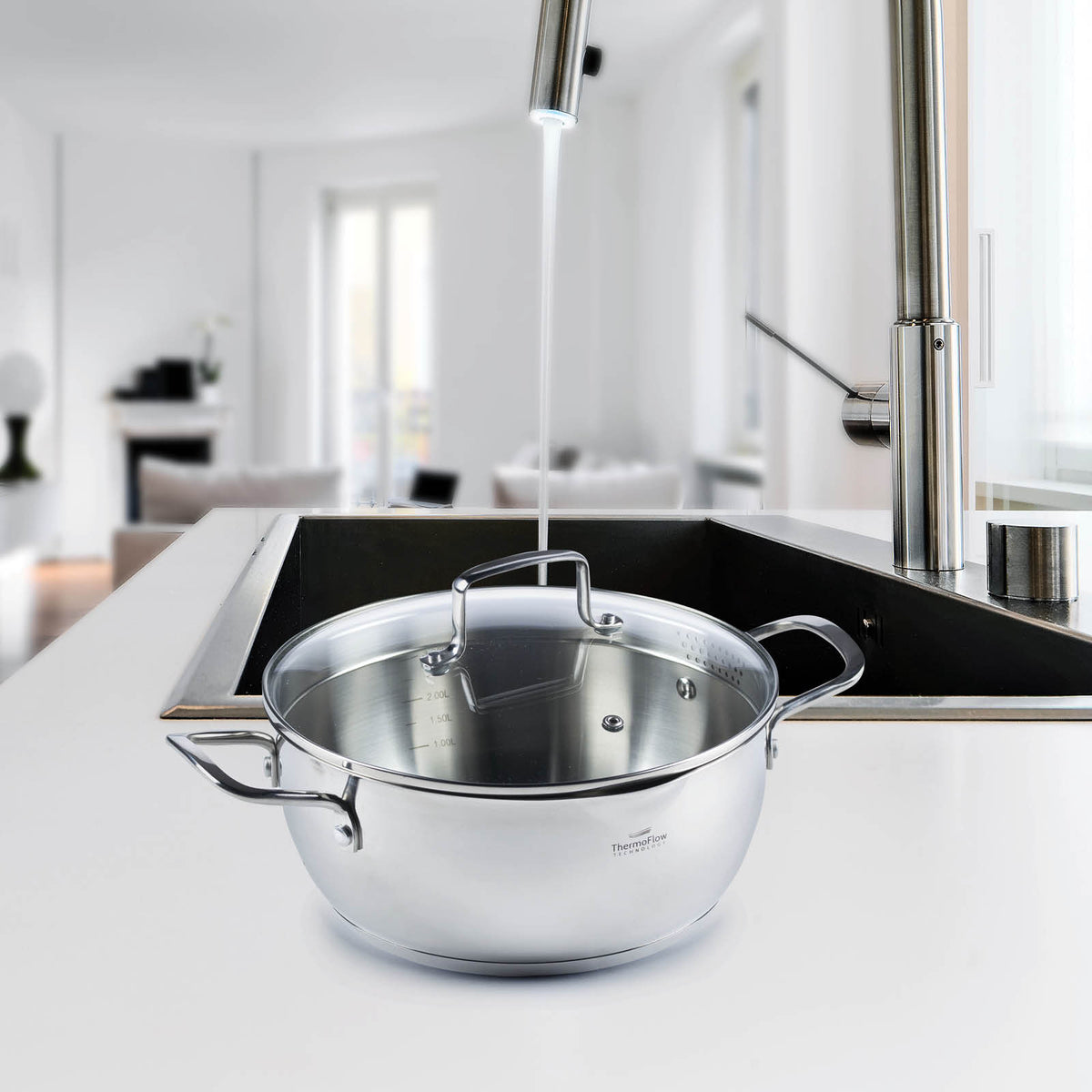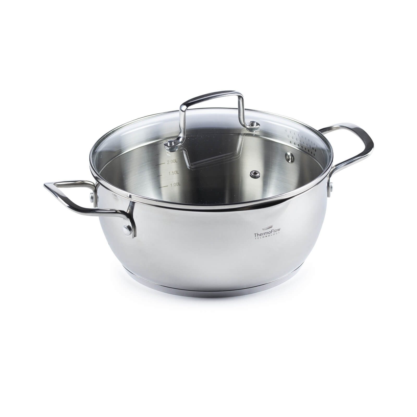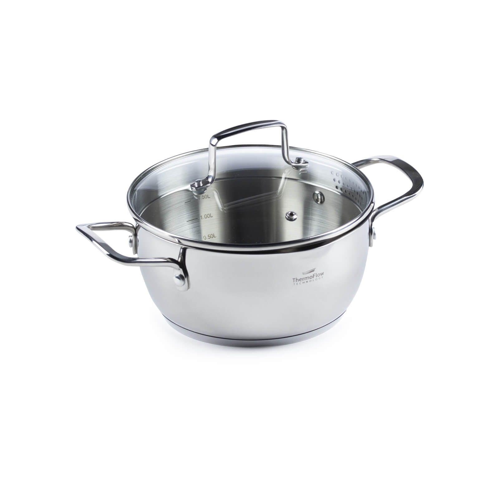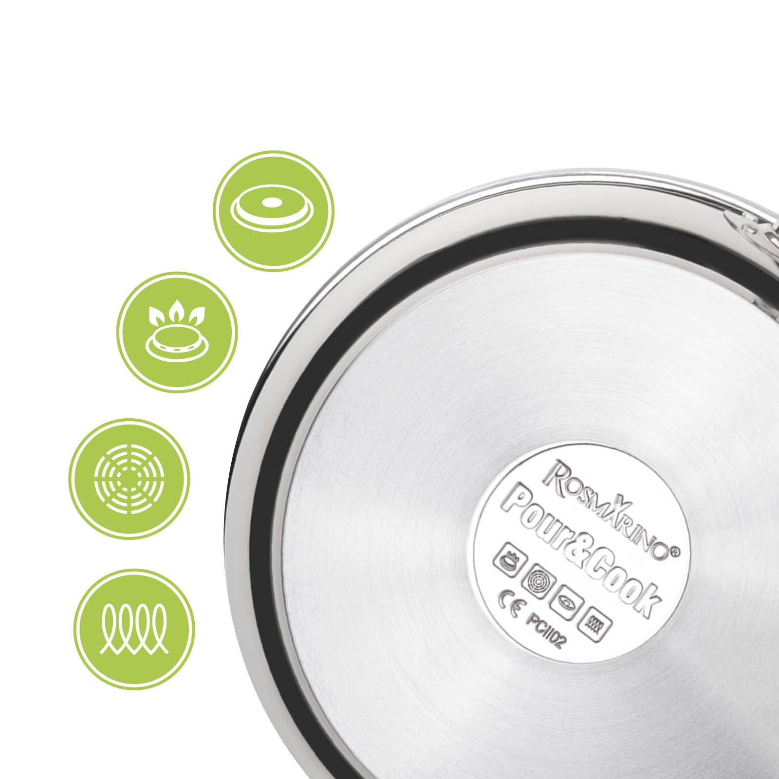 Plieninis puodas su stikliniu dangčiu Pour&Cook pagamintas iš nesunaikinamo 18/10 plieno su 3 sluoksnių pagrindu, kad greitai ir tolygiai įkaistų bei sutrumpintų kepimo laiką. ThermoFlow technologija užtikrina puikų šilumos paskirstymą visame prikaistuvio paviršiuje, todėl maistas ruošiamas tolygiai. Paprastesniam maisto gaminimui puode yra matavimo skalė, snapelis, specialiai sukurtas dangtis ir į išorę nukreiptas kraštas, kad būtų lengviau pilti ir garinti. Tinka visoms kaitlentėms, įskaitant indukcines. Jį lengva valyti, nes galima plauti indaplovėje.