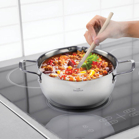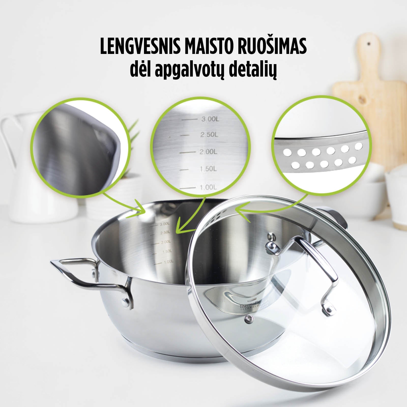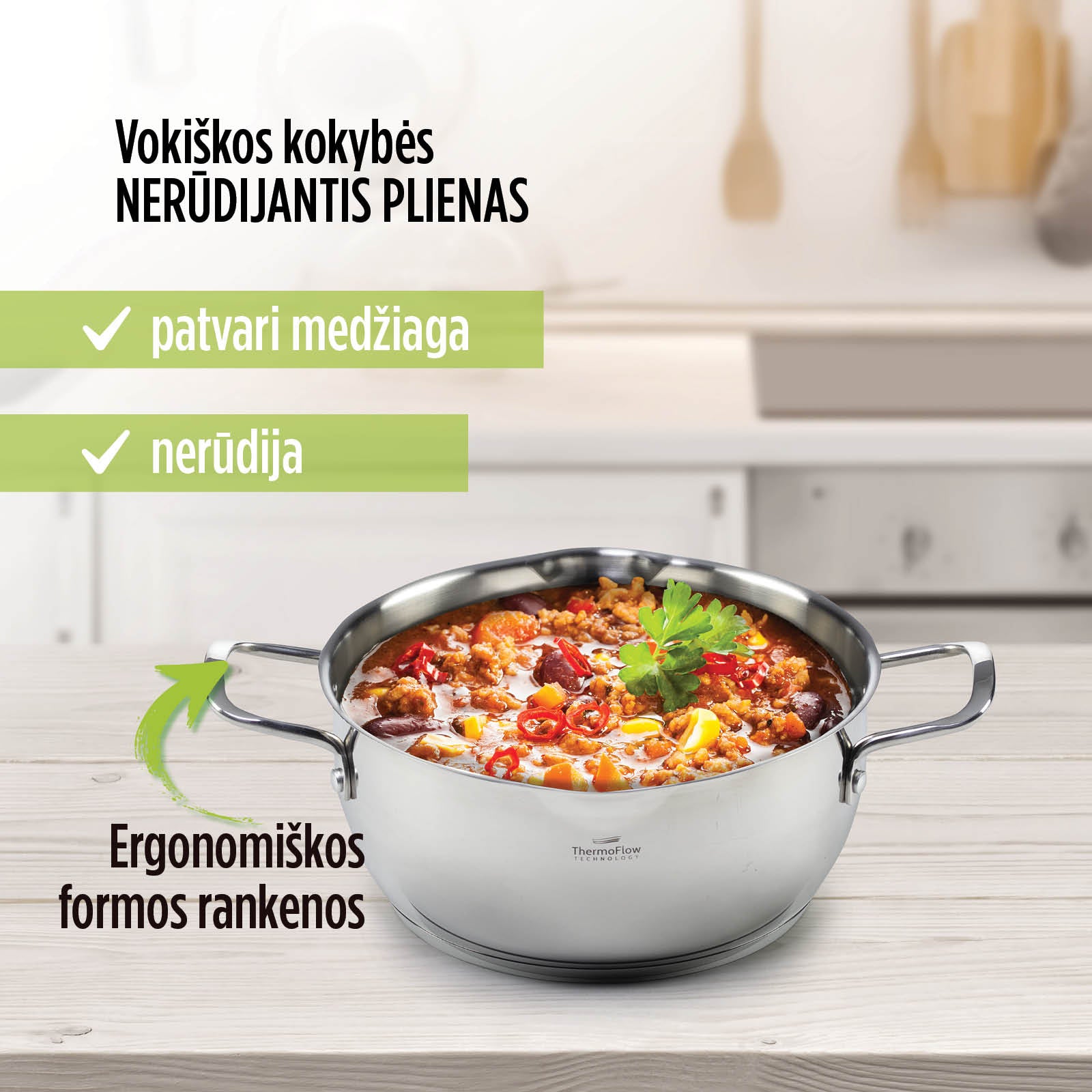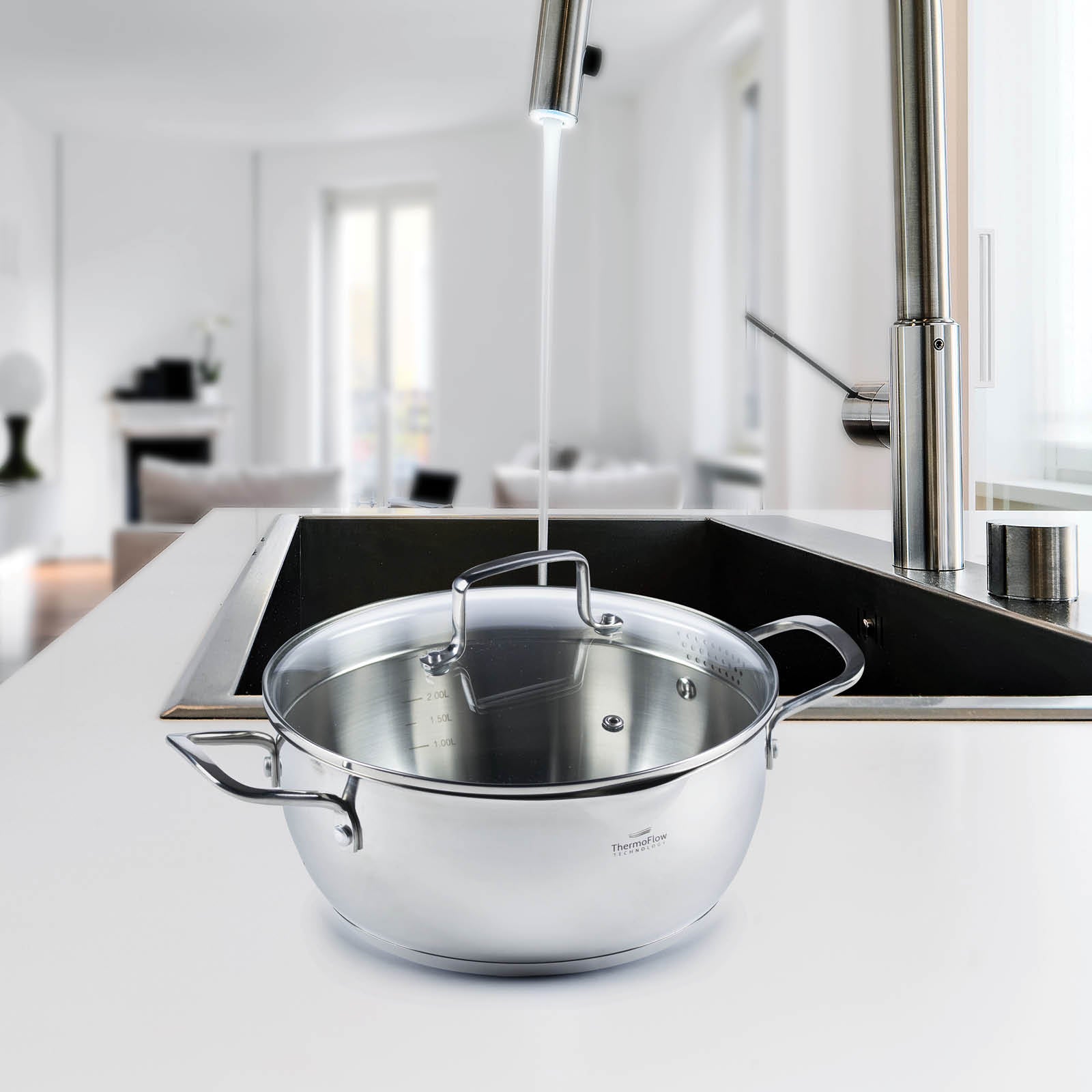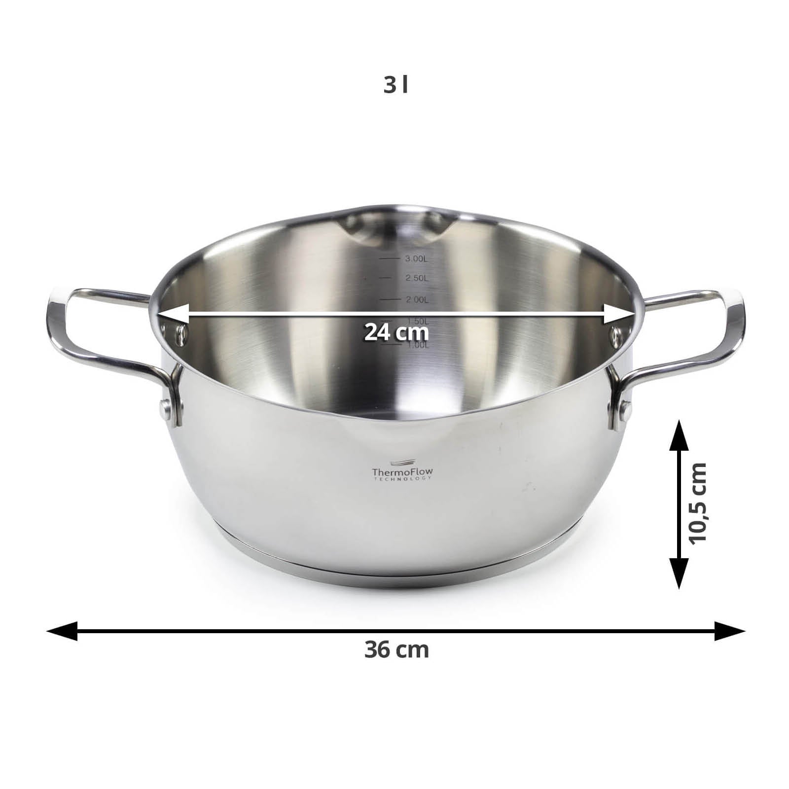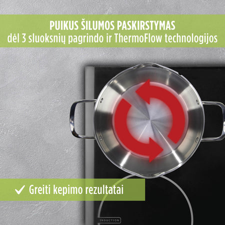 Aukščiausios kokybės 18/10 nerūdijančiojo plieno puodai ir keptuvės su 3 sluoksnių smūginiu dugnu, kad greitai įkaistų ir tolygiai gamintų maistą. Storas aukščiausios kokybės vokiško nerūdijančio plieno sluoksnis, aliuminio šerdis, užtikrins gerą šilumos laidumą, o nerūdijančio plieno išorė užtikrins ilgaamžiškumą, atsparumą ir veiksmingą maisto ruošimą. ThermoFlow technologija užtikrina tolygų šilumos pasiskirstymą visame indų paviršiuje, todėl plieninis indų karkasas tinkamai įkaista ir leidžia greitai ir itin efektyviai gaminti maistą.