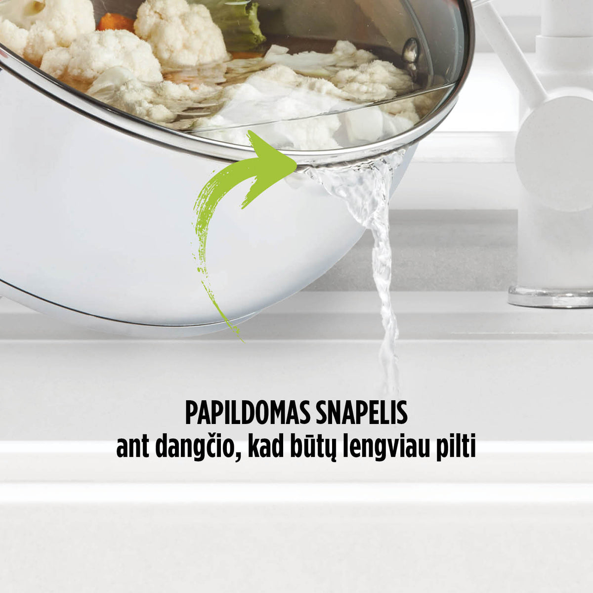 - Matavimo skalė, specialios formos puodo kraštas, specialus dangtis ir ergonomiška nerūdijančiojo plieno rankena su tuščiaviduriu paviršiumi leis mėgautis aukšto lygio gaminimu.