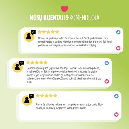 - Visi mūsų puodai ir keptuvės sukurti pagal aukščiausius standartus, juose nėra kenksmingo PFOA ar kitų kenksmingų medžiagų.