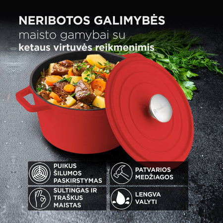 Jie puikiai tinka guliašų, troškinių, sriubų, rizotų ir kitų skanių patiekalų ruošimui. Puodas toks patvarus, kad jūsų virtuvėje tarnaus dešimtmečius.