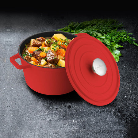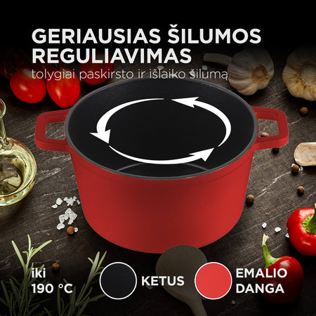 Puodas puikiai išlaiko šilumą ir tolygiai ją paskirsto visame paviršiuje. Trisluoksnė emalio danga užtikrina, kad maistas nepriliptų prie puodo dugno.