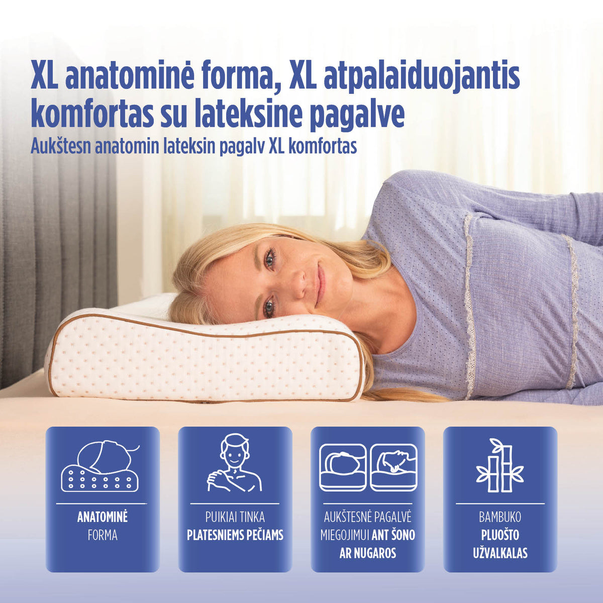 XL Comfort anatominė latekso pagalvė yra puikus pasirinkimas tiems, kurie nori atsipalaiduoti naktį, puikios atramos kaklui ir nejausti skausmo ryte. Lateksas laikomas aukščiausios kokybės medžiaga, kuri turi itin lanksčią tekstūrą, idealiai tinka jūsų stuburo padėčiai, o taip pat yra viena iš patvaresnių medžiagų pagalvių pasaulyje. Ant jo niekada nebus karšta, nes jis užtikrina geresnį oro srautą ir sumažina prakaitavimą naktį. Anatominė pagalvės forma atpalaiduoja kaklą ir pečius, puikiai tinka tiems, kurie mėgsta miegoti ant šono ar nugaros.