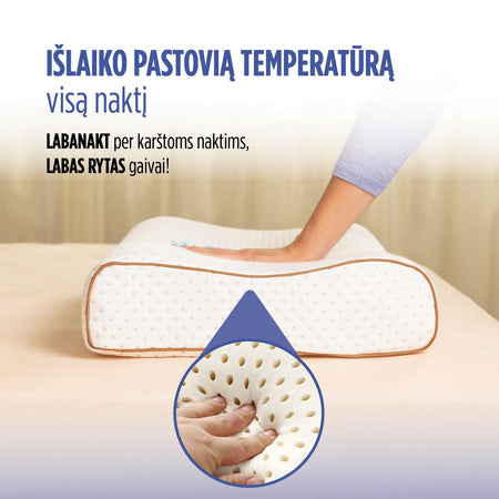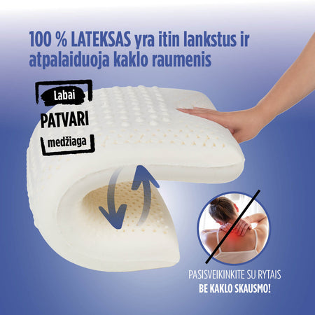 - 100 % lateksas išlaiko formą ir elastingumą, todėl tinka visiems, kenčiantiems nuo kaklo ir pečių skausmų.