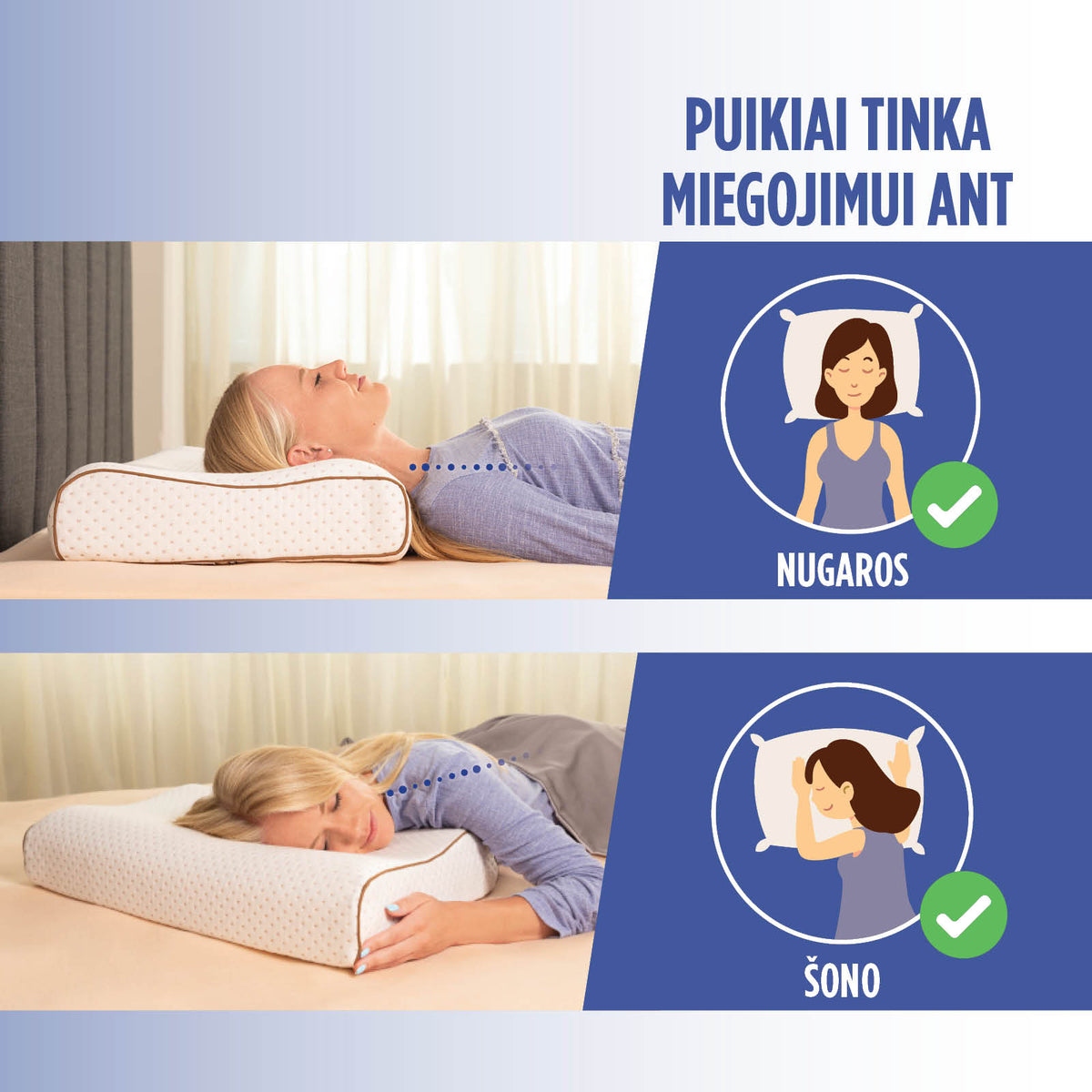 Lanksti anatominė forma suteikia patogiausią kaklo padėtį ir visą naktį išlaiko slankstelius teisingoje padėtyje. Ergonomiška latekso pagalvė idealiai tinka visiems, miegantiems šonuose ir nugaroje, atpalaiduoja kaklo ir pečių raumenis ir be skausmo ryte.
