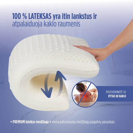 - Latekso šerdis išlaiko formą ir lankstumą, todėl ši pagalvė tinka tiems, kurie kenčia nuo natūralaus kaklo skausmo.