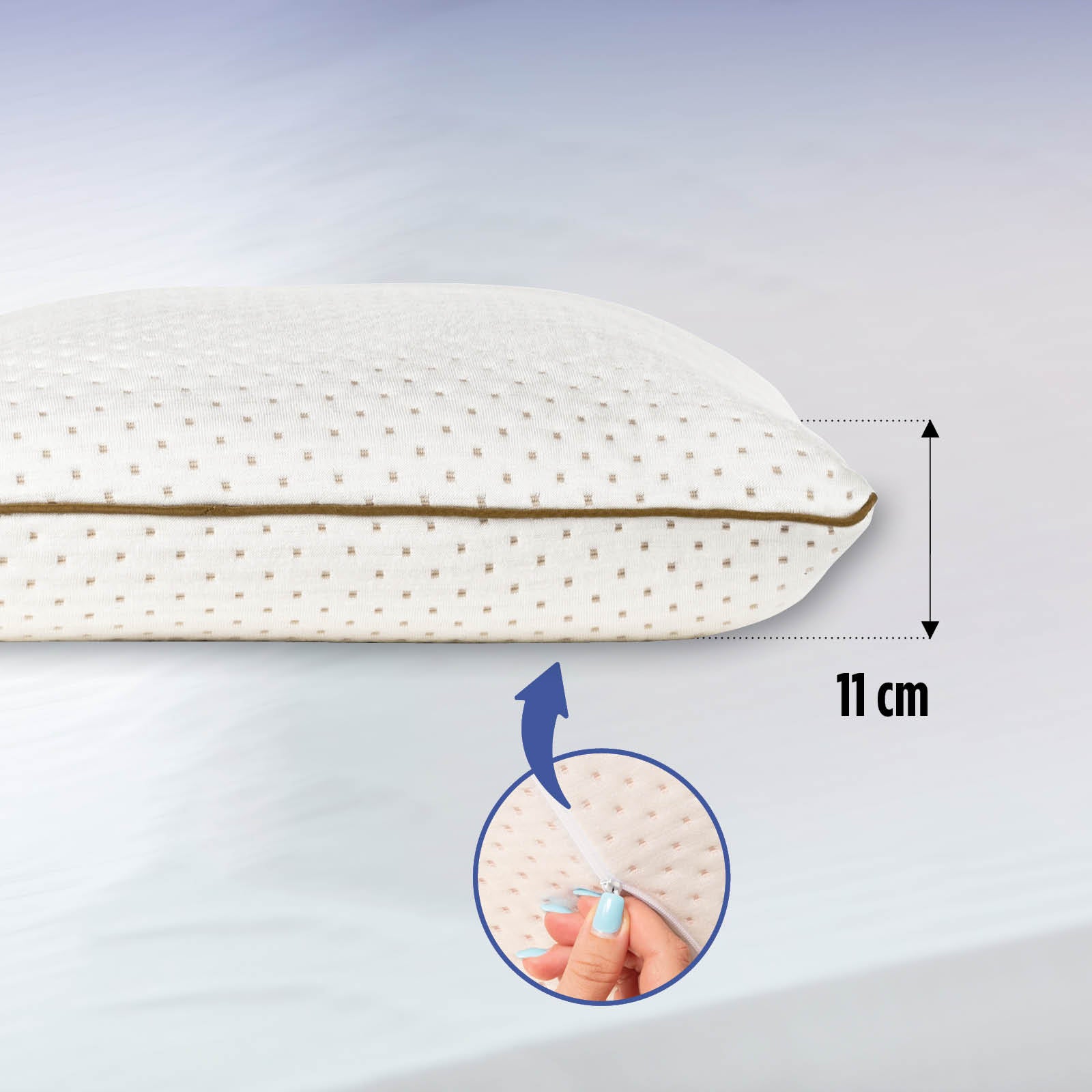 - Nuimamas pagalvės užvalkalas skalbiamas 40 °C temperatūroje, todėl tinka turintiems jautrią ir probleminę odą, alergiškiems* ir sergantiems astma. *Išimtis yra lateksui alergiški žmonės, kuriems pagalvė nerekomenduojama.