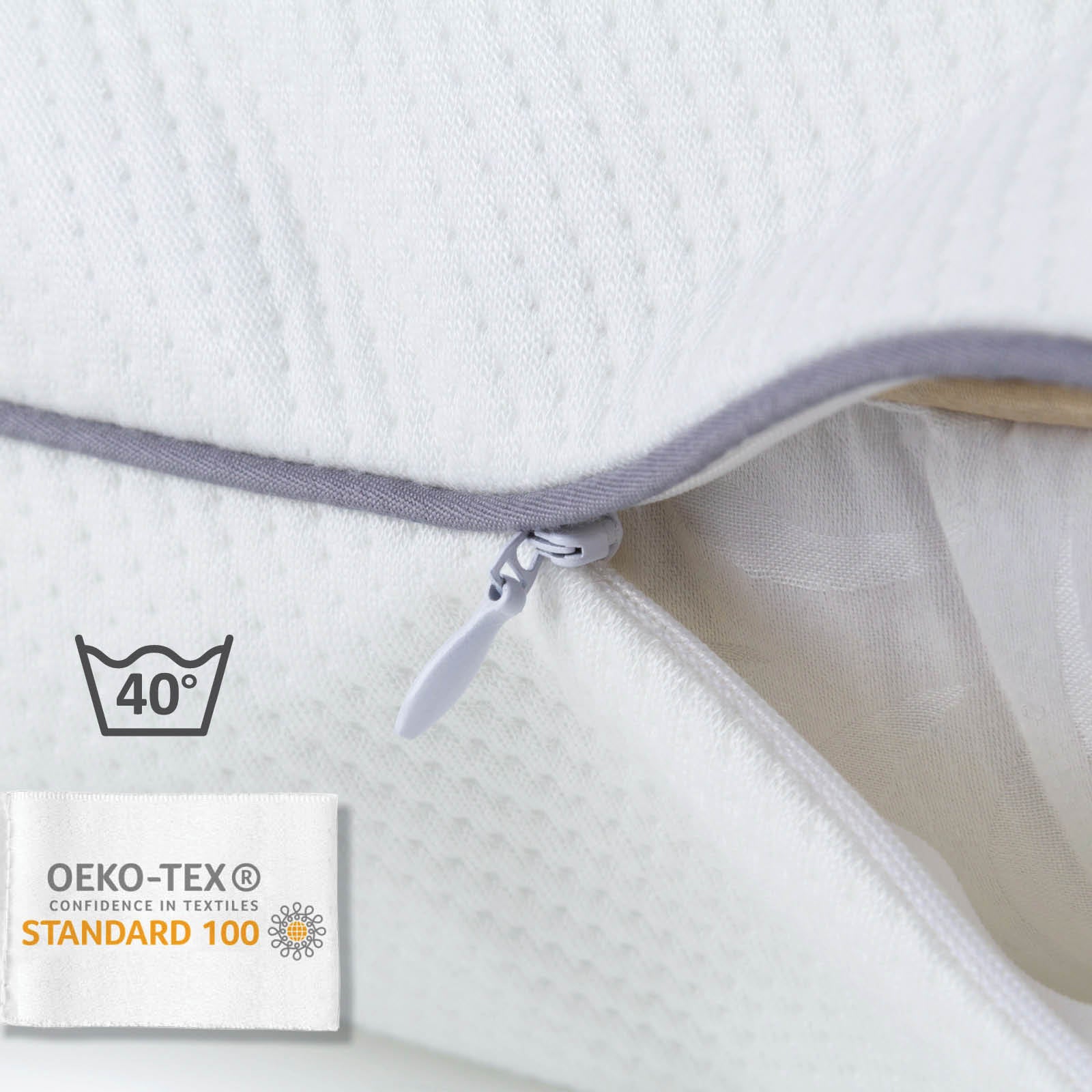 MemoSilver pagalvės apsauga, skirta pagalvėms iki 50 x 70 cm, veiksmingai saugo jūsų pagalvę. Vandeniui atspari apsauga efektyviai apsaugo nuo dulkių erkučių ir dėmių. Sidabro jonais praturtintas audinys padeda slopinti bakterijų dauginimąsi, todėl miego aplinka tampa higieniškesnė ir be nemalonių kvapų. Kvėpuojantis audinys užtikrina oro cirkuliaciją, o natūralios drėgmės sugėrimo savybės miego metu palaiko gaivą, sausumą ir komfortą. Patogus užtrauktukas leidžia lengvai užvilkti ir nuvilkti apsaugą skalbimui skalbyklėje.