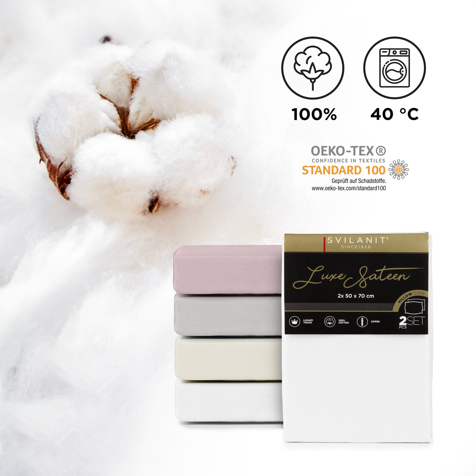2 dalių Svilanit Luxe Sateen medvilninių pagalvių užvalkalų rinkinys – tai puikus komforto, švelnumo ir pasilepinimo naktį derinys. Minimalistiniai vienspalviai užvalkalai pagaminti iš erdvaus ir minkšto medvilnės satino, kuris švelniai liečiasi prie odos. Derinkite juos su mėgstama patalyne. Lengva užsegti užtrauktuku. Užvalkalai skalbiami 40 °C temperatūroje.