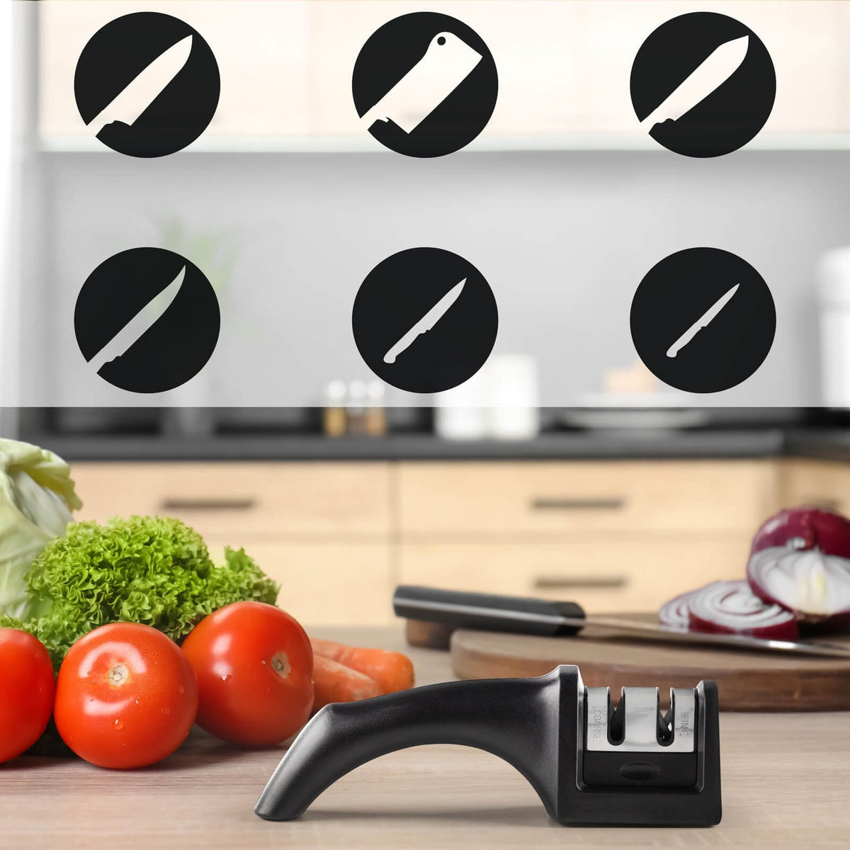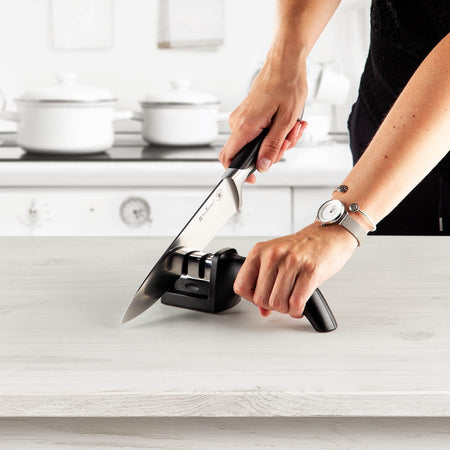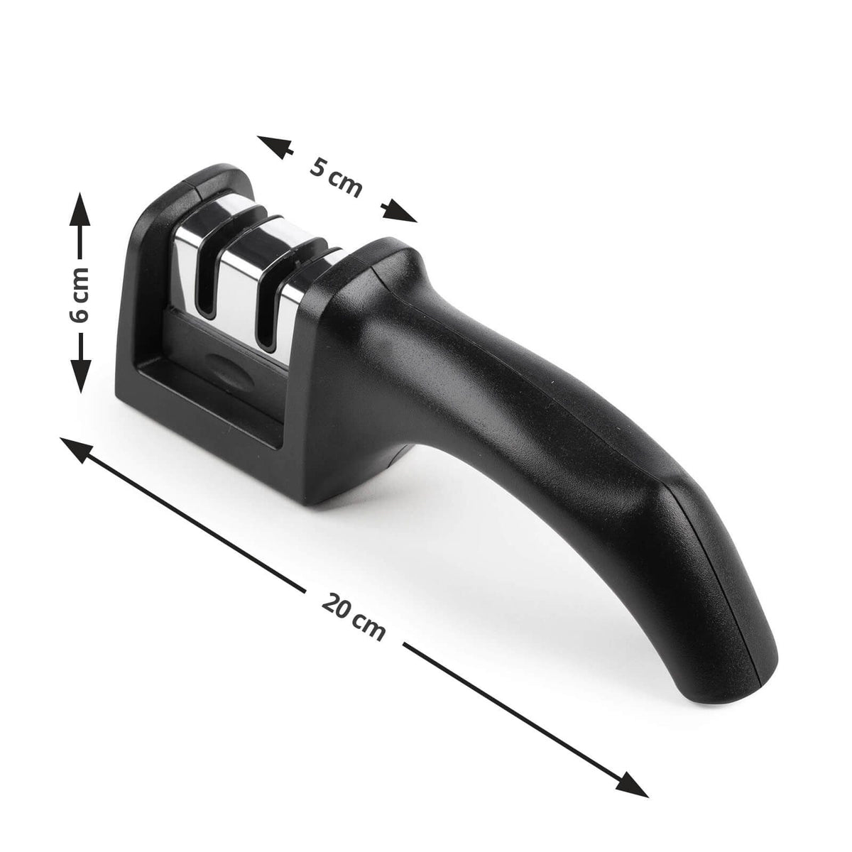 Buki ir subraižyti peiliai – jau praeitis! Rosmarino rankinis galąstuvas skirtas visų tipų plieniniams virtuviniams peiliams pagaląsti, yra visiškai saugus ir paprastas naudoti. Kad jūsų peiliai būtų kuo aštresni, galąstuvas turi du šlifavimo plieno angas, naudojamas pagal peilio bukumą. Du lygiai leidžia galąsti grubiai ir tiksliai. Grubus galandimas pagaląs net ir bukiausius ar labai subraižytus peilius, o tikslus galandimas dar aštriau pagaląs peilius. Galandimo kampas yra 25–30°, o tai reiškia, kad galąstuvas ilgiau išlaikys patvarius ir aštrius kraštus. Puikiai tinka daugeliui plieninių peilių, naudojamų buityje. Apatinėje rankenos ir galandimo galvutės pusėje yra neslystantis padas, kuris galandimo metu išlaiko galąstuvą vietoje. Dėl mažo dydžio jį galima naudoti bet kurioje virtuvėje, o taip pat pasiimti su savimi į stovyklas ar iškylas.