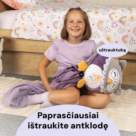 Sveiki, vaikai ir tėveliai! Kiekvieną pelėdą galima naudoti bent 3 būdais: kaip minkštą žaislą, pūkuotą pagalvę ar šiltą antklodę. Tiesiog atidarykite pelėdos pilvą ir ištraukite antklodę. Puikiai tinka naudoti namuose, automobilyje ar atostogų metu.