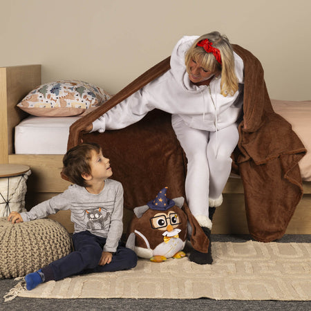 Sveiki, vaikai ir tėveliai! Kiekvieną pelėdą galima naudoti bent 3 būdais: kaip minkštą žaislą, pūkuotą pagalvę ar šiltą antklodę. Tiesiog atidarykite pelėdos pilvą ir ištraukite antklodę. Puikiai tinka naudoti namuose, automobilyje ar atostogų metu.