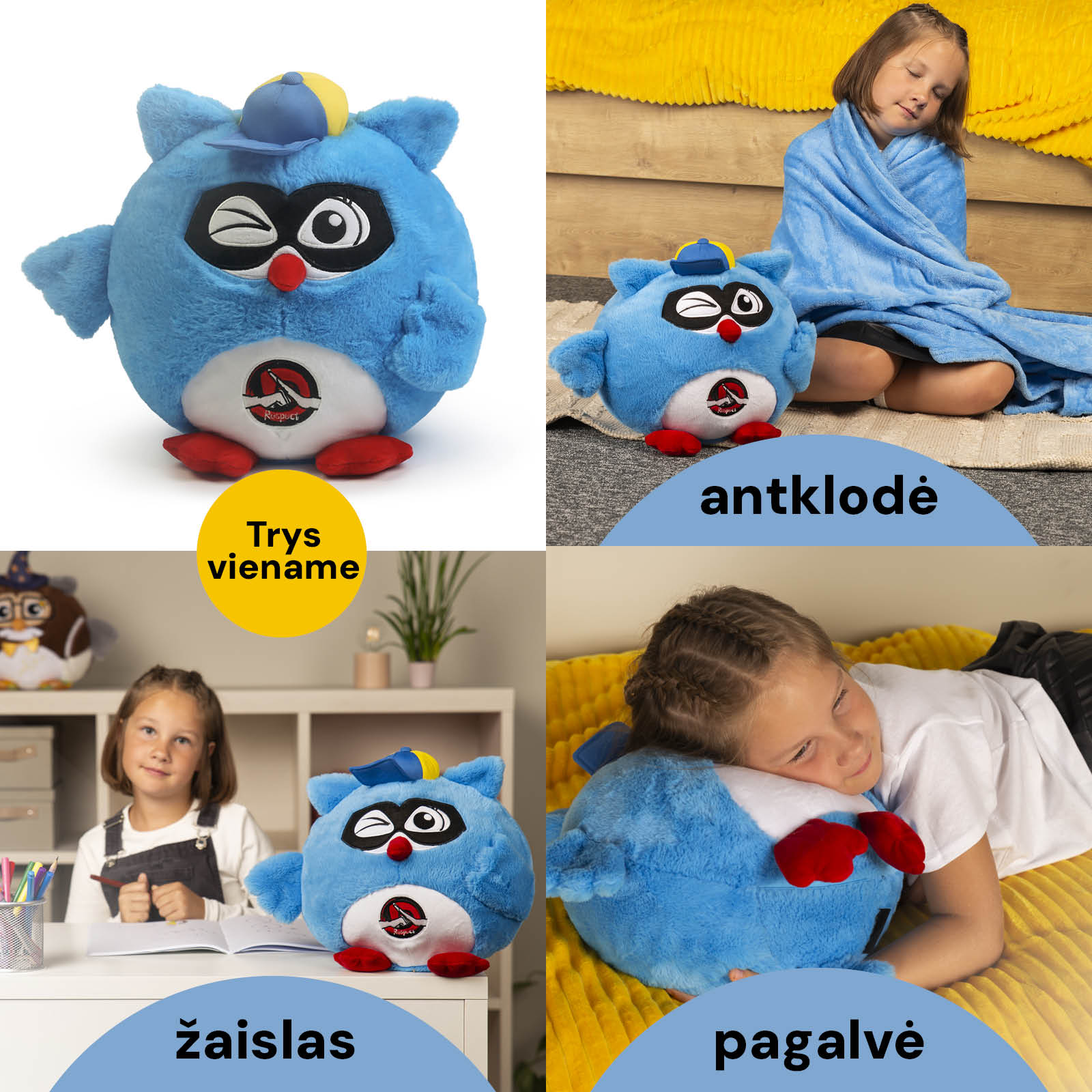 Sveiki, vaikai ir tėveliai! Kiekvieną pelėdą galima naudoti bent 3 būdais: kaip minkštą žaislą, pūkuotą pagalvę ar šiltą antklodę. Tiesiog atidarykite pelėdos pilvą ir ištraukite antklodę. Puikiai tinka naudoti namuose, automobilyje ar atostogų metu.