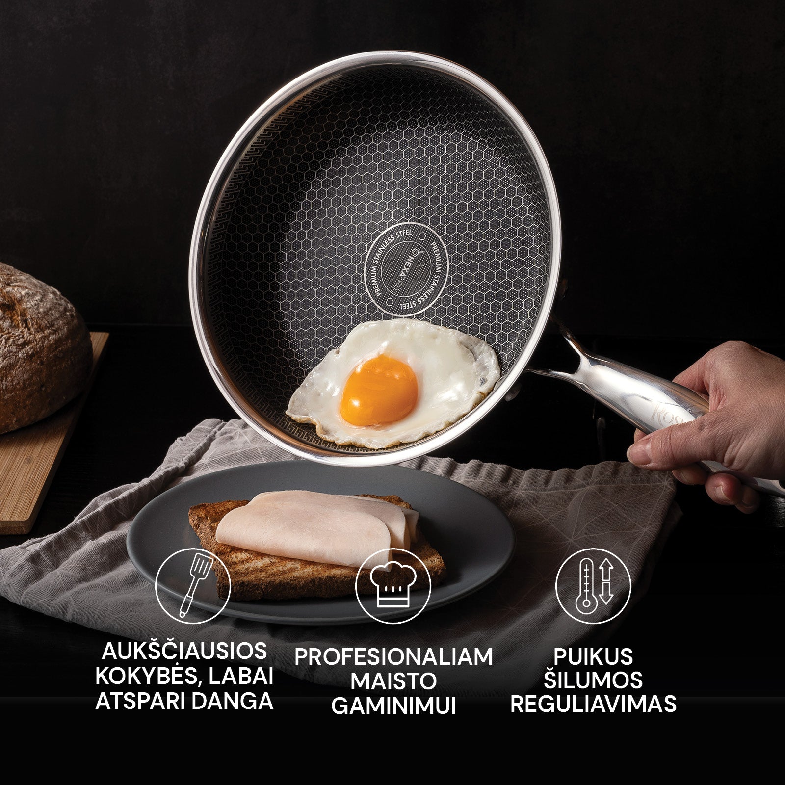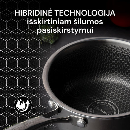Pristatome naują tobulumo sinonimą: nerūdijančiojo plieno ilgaamžiškumas ir nelimpančio paviršiaus patogumas, kuris dar labiau palengvina gaminimą. HexaPRO – tai inovatyvios hibridinės technologijos rezultatas, sujungiantis daugiasluoksnę indų konstrukciją profesionaliems rezultatams pasiekti. Tai premium klasės virtuvės indai, kurie pakylėja jūsų kulinarinius įgūdžius į aukštesnį lygį.