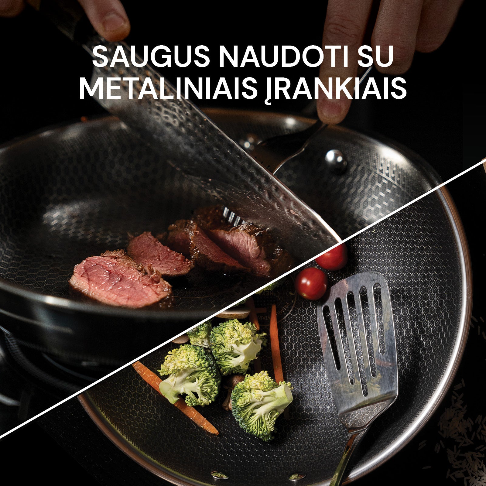 Visa HexaPRO virtuvės indų linija padengta itin patvariu, įbrėžimams atspariu sluoksniu. Tai reiškia, kad nei peiliai, nei metalinės mentelės nepažeis indo paviršiaus. Lazeriu išpjautos plieninės šešiakampės formos užtikrina tvirtą paviršių, tolygų šilumos pasiskirstymą ir nepriekaištingą gaminimą.