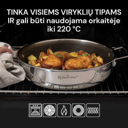 Aukščiausios kokybės Rosmarino HexaPRO virtuvės indų linija – tai tinkamas pasirinkimas tiems, kurie siekia profesionalių rezultatų gaminant. Išskirtinis patvarumas ir pažangi hibridinė technologija užtikrina tolygiai iškepusius patiekalus. Indai padengti itin atsparia, praktiškai nesusidėvinčia danga, kuri nebijo įbrėžimų. Be jokių kompromisų juos galite naudoti ant visų tipų kaitlenčių ir net orkaitėje iki 220 °C. Tai premium klasės virtuvės indai, kurie pakylėja jūsų kulinarinius įgūdžius į aukštesnį lygį. Su šia universalia keptuve galite ruošti daržovių, mėsos, žuvies, saldžius ar pikantiškus patiekalus ir naudoti įvairius gaminimo būdus – gruzdinti, kepti ar troškinti.