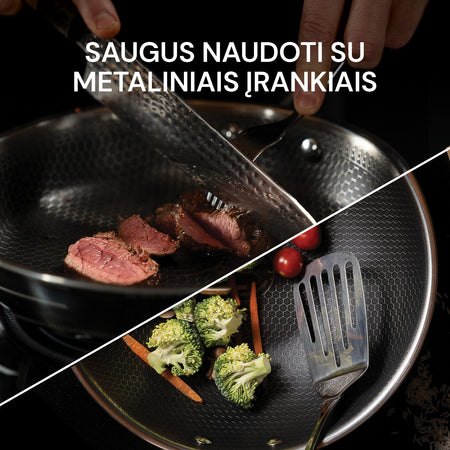Visa HexaPRO virtuvės indų linija padengta itin patvariu, įbrėžimams atspariu sluoksniu. Tai reiškia, kad nei peiliai, nei metalinės mentelės nepažeis indo paviršiaus. Lazeriu išpjautos plieninės šešiakampės formos užtikrina tvirtą paviršių, tolygų šilumos pasiskirstymą ir nepriekaištingą gaminimą.