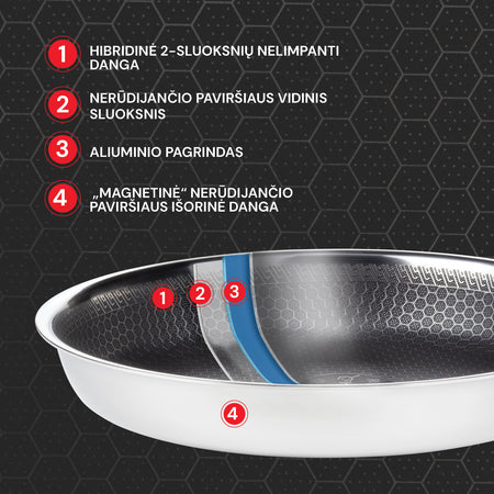 - Hibridinis medžiagų derinys – nerūdijantis plienas, aliuminis ir nelimpanti danga – užtikrina greitą ir tolygų šilumos pasiskirstymą, maksimalų tvirtumą ir atsparumą įbrėžimams.