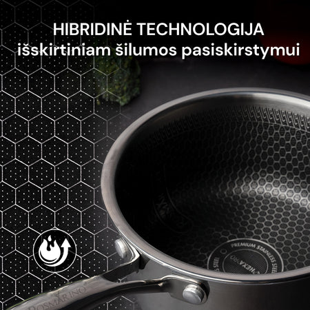 Pristatome naują tobulumo sinonimą: nerūdijančiojo plieno ilgaamžiškumas ir nelimpančio paviršiaus patogumas, kuris dar labiau palengvina gaminimą. HexaPRO – tai inovatyvios hibridinės technologijos rezultatas, sujungiantis daugiasluoksnę indų konstrukciją profesionaliems rezultatams pasiekti. Tai premium klasės virtuvės indai, kurie pakylėja jūsų kulinarinius įgūdžius į aukštesnį lygį.