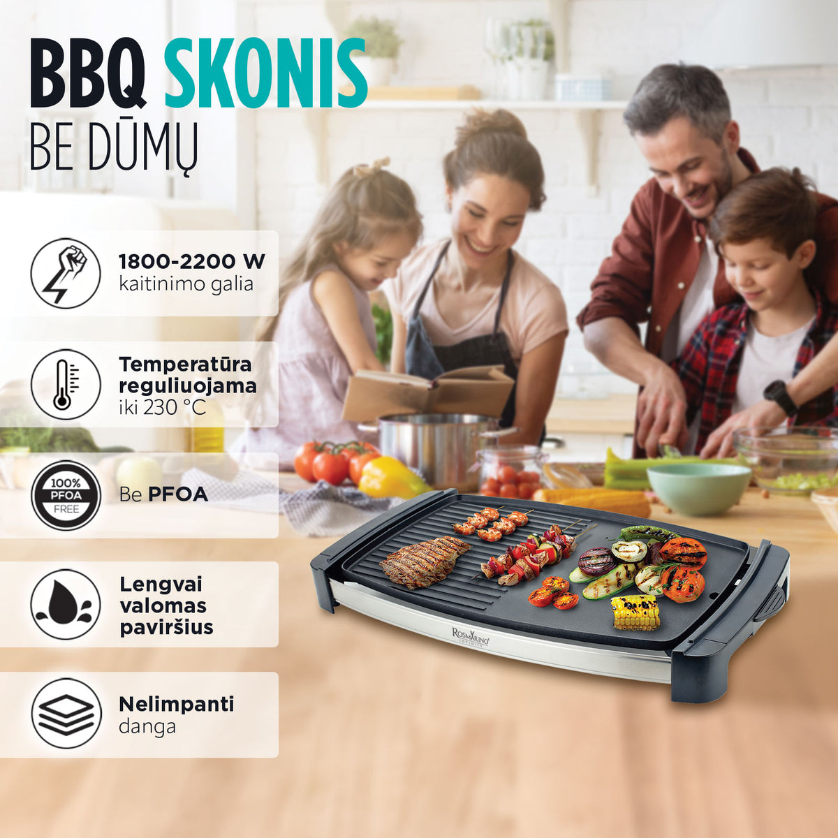 Išvenkite nenuspėjamų orų ir kepkite grilyje bet kur ir bet kokiu oru. Elektrinį grilį galite naudoti bet kur - ant virtuvės stalo, balkone, kieme, lauko virtuvėje ar atostogų metu.