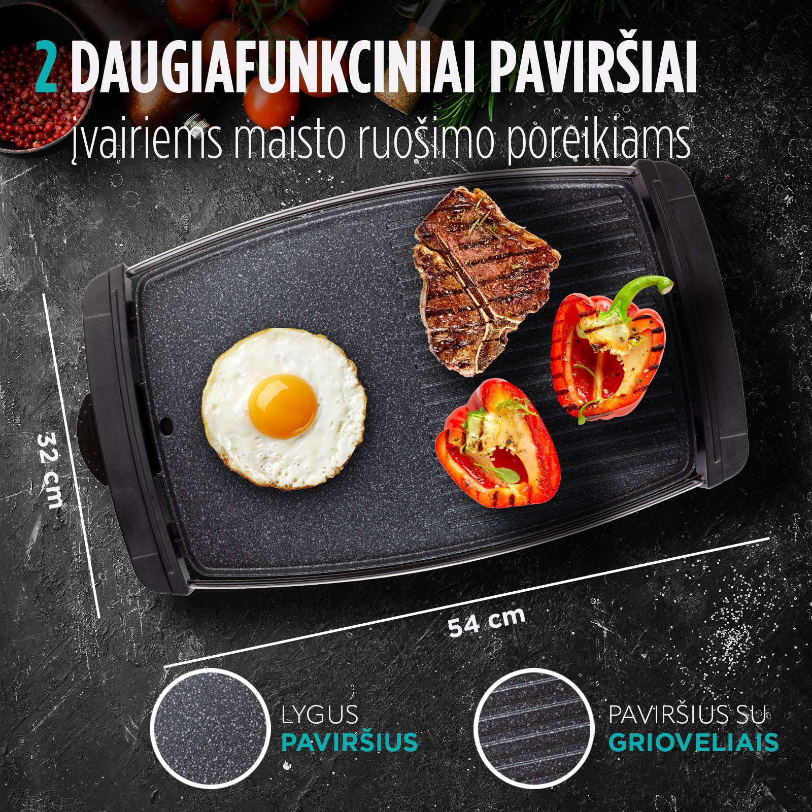 Didelė grilio plokštė turi lygų ir grioveliais išraižytą paviršių, todėl galėsite lengvai pasirinkti, kur ruošti mėsą, daržoves, kiaušinius, mėsainius, žuvį ar net blynus.