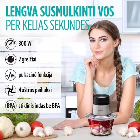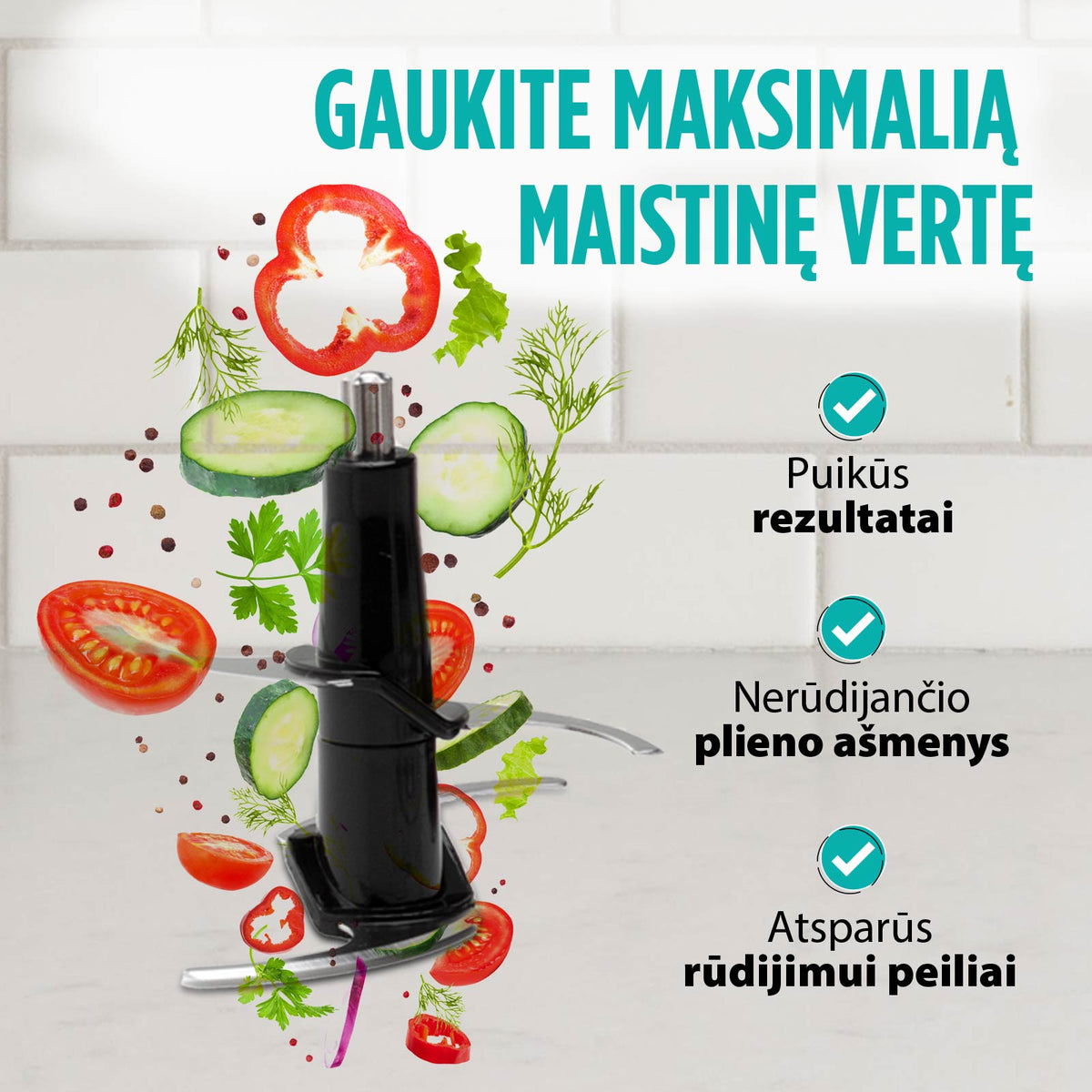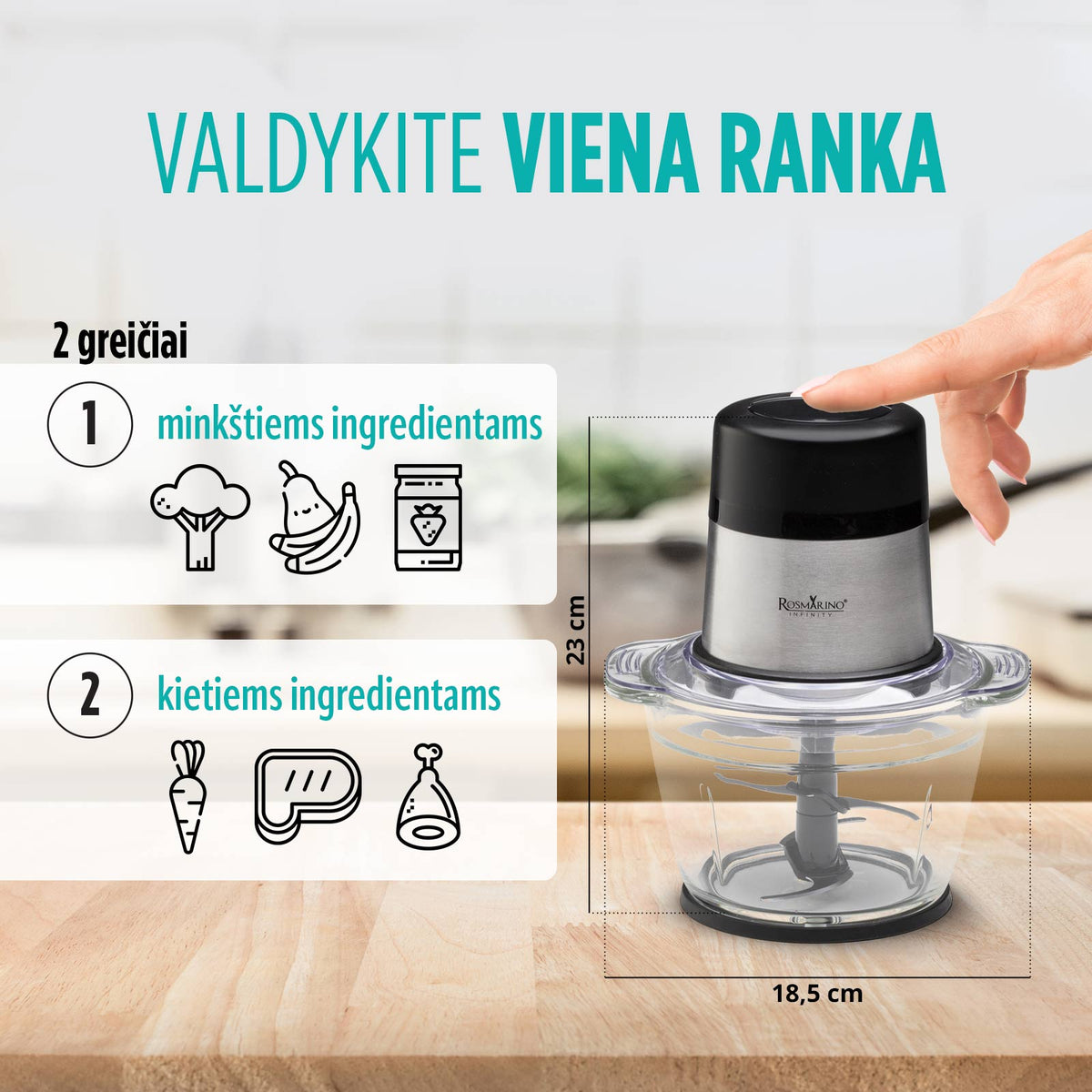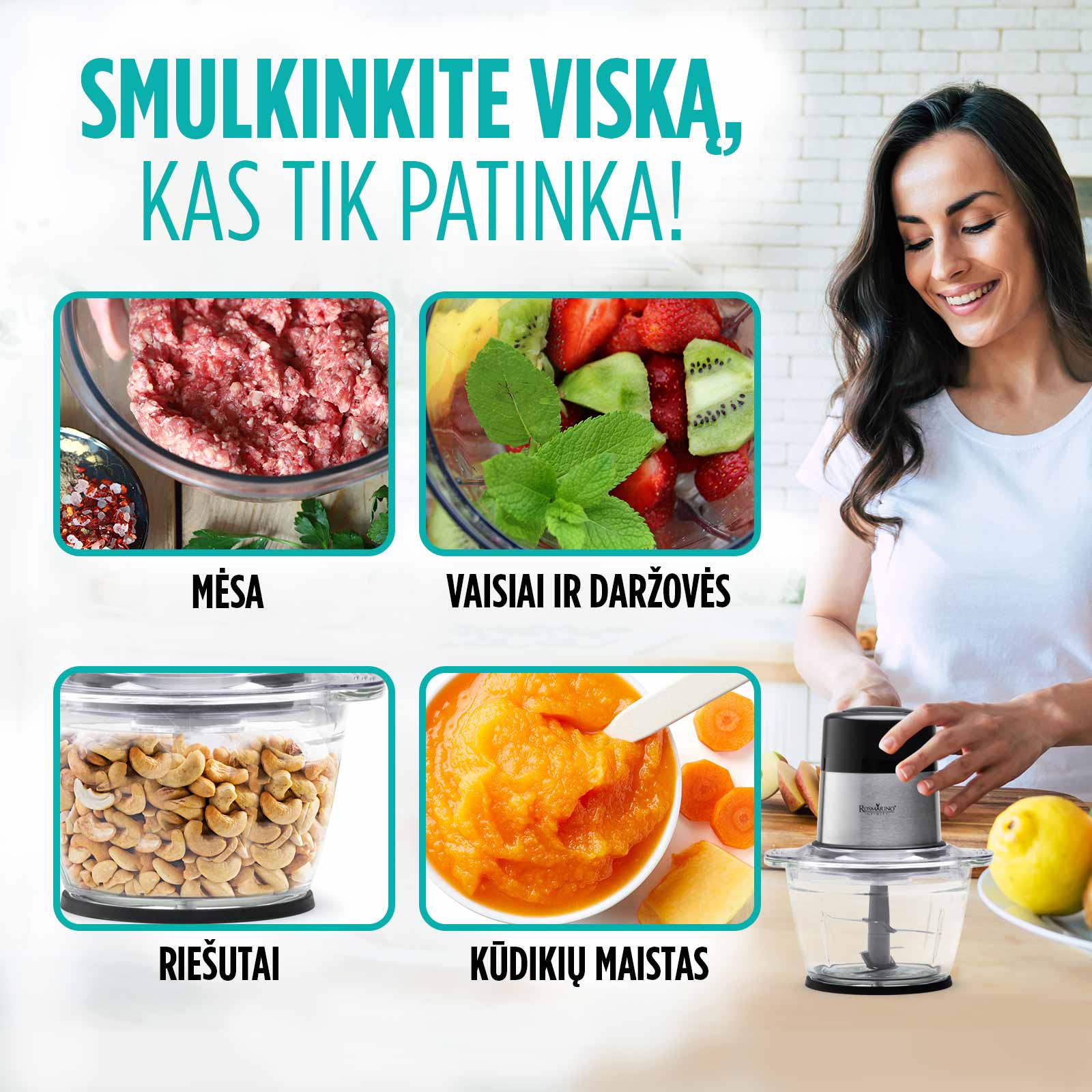 - Maisto ruošimo valdymas vienu prisilietimu be sudėtingų mygtukų ar ekranų. Tiesiog įjunkite smulkintuvą vienu mygtuko paspaudimu ir leiskite jam viską susmulkinti už jus!