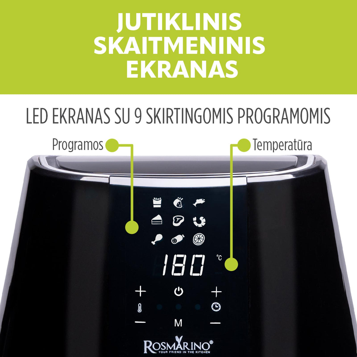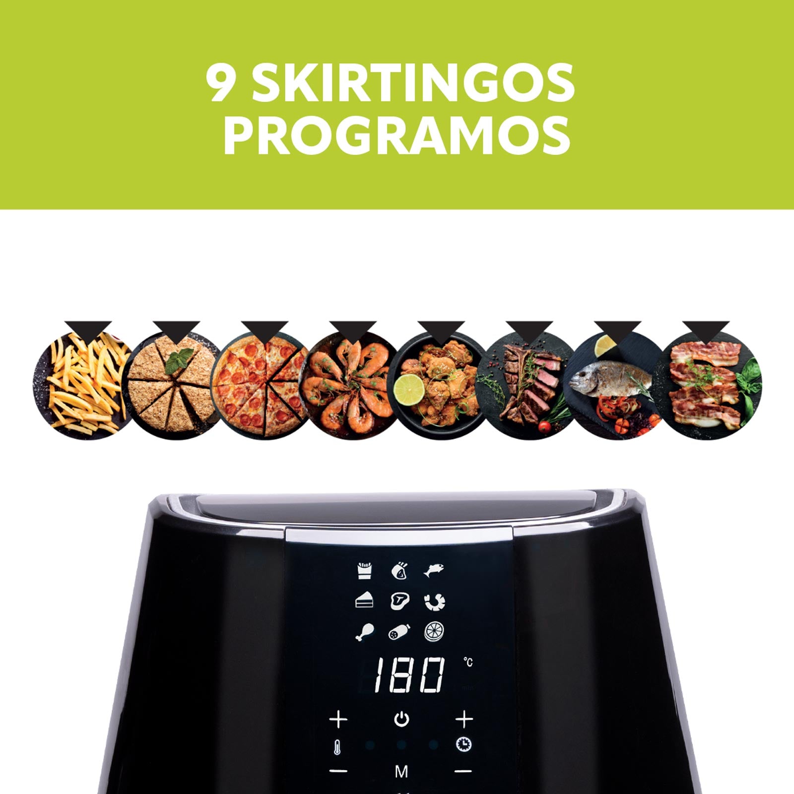 - LED ekranas, kad būtų lengva kontroliuoti temperatūrą: 9 skirtingi nustatymai, kad puikiai pagamintumėte bulvytes, kiaulieną, žuvies pirštelius, saldumynus, kepsnius, krevetes, vištieną, dešreles ar net mažas picas!
