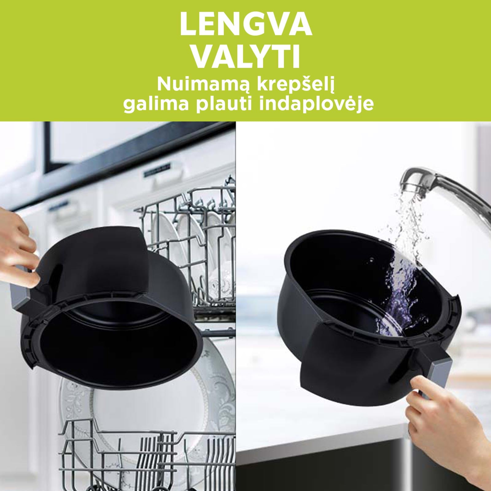 - Dėl krepšelio rankenos, kuri išlieka visiškai vėsi net gruzdinimo metu, naudoti karšto oro gruzdintuvę bus dar paprasčiau, o jos nešimas prie stalo – visiškai saugus.