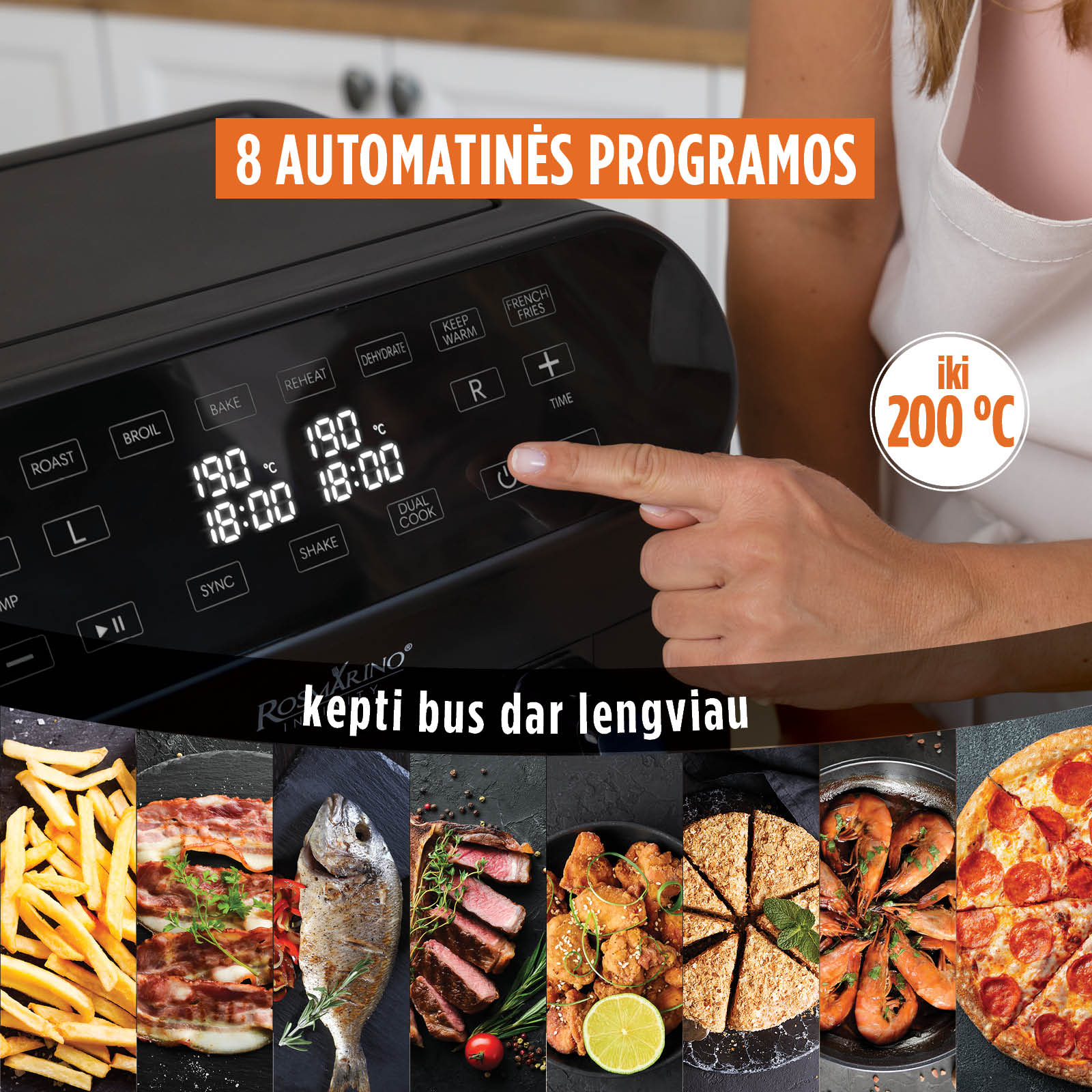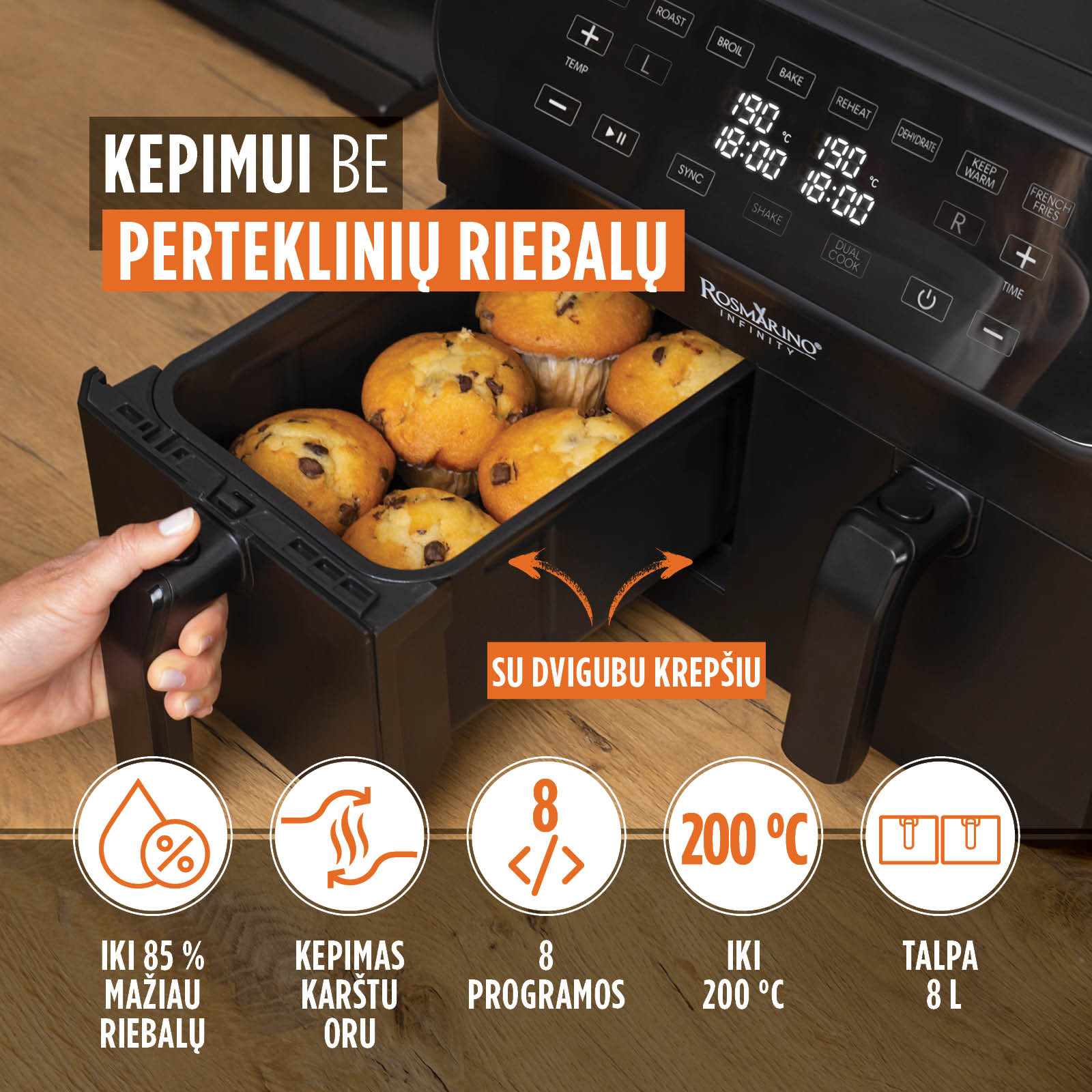 Norite pasigaminti skanius pietus be papildomų puodų ir nenaudojant orkaitės? Ir be erzinančio gruzdinimo kvapo? Pamirškite orkaitę ir senus kepimo būdus, sutaupykite laiko bei energijos. Rosmarino Infinity PRO XX karšto oro gruzdintuvė padeda greičiau ir sveikiau paruošti maistą. Kepant karštu oru išsaugomos maisto produktuose esančios maistinės medžiagos. Kepkite traškias bulvytes, sparnelius, žuvies pirštelius ar desertus su 85 % mažiau riebalų. Galimos 8 funkcijos, įskaitant vaisių ir daržovių džiovinimą. Paruoškite pietus 2 atskiruose krepšeliuose, nustatydami kiekvieno patiekalo temperatūrą ir gaminimo laiką.