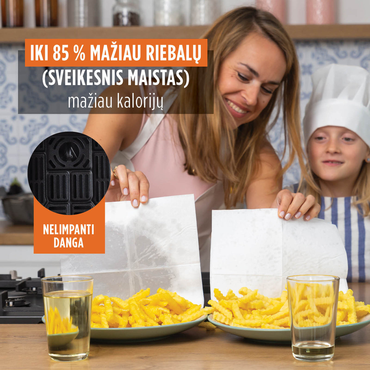 - Sveikiau gruzdinkite karštu oru, kad galėtumėte mėgautis mažiau kaloringu maistu. Iki 85 % mažiau riebalų, palyginti su įprastiniu gruzdinimu.