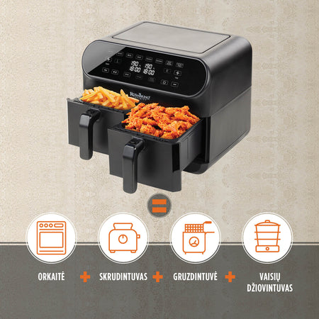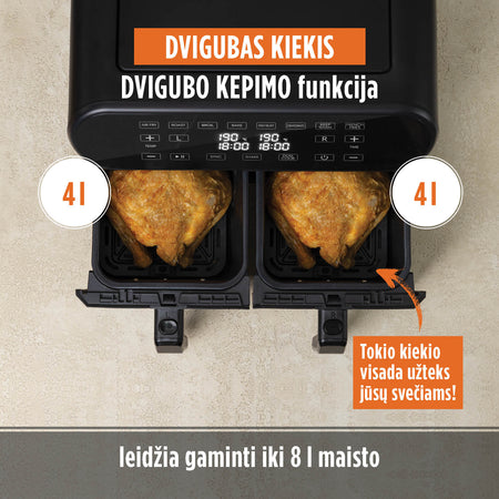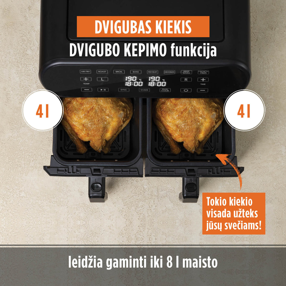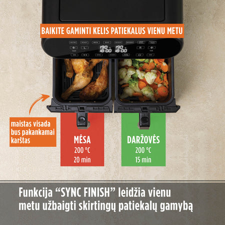 Gruzdintuvėje galima sinchronizuoti kepimo laiką abiejuose krepšiuose. Taip skirtingi maisto produktai bus paruošti tuo pačiu metu. Tiesiog naudokite funkciją Sinchronizuoti ir kiekvienam krepšeliui atskirai nustatykite temperatūrą ir gaminimo laiką.