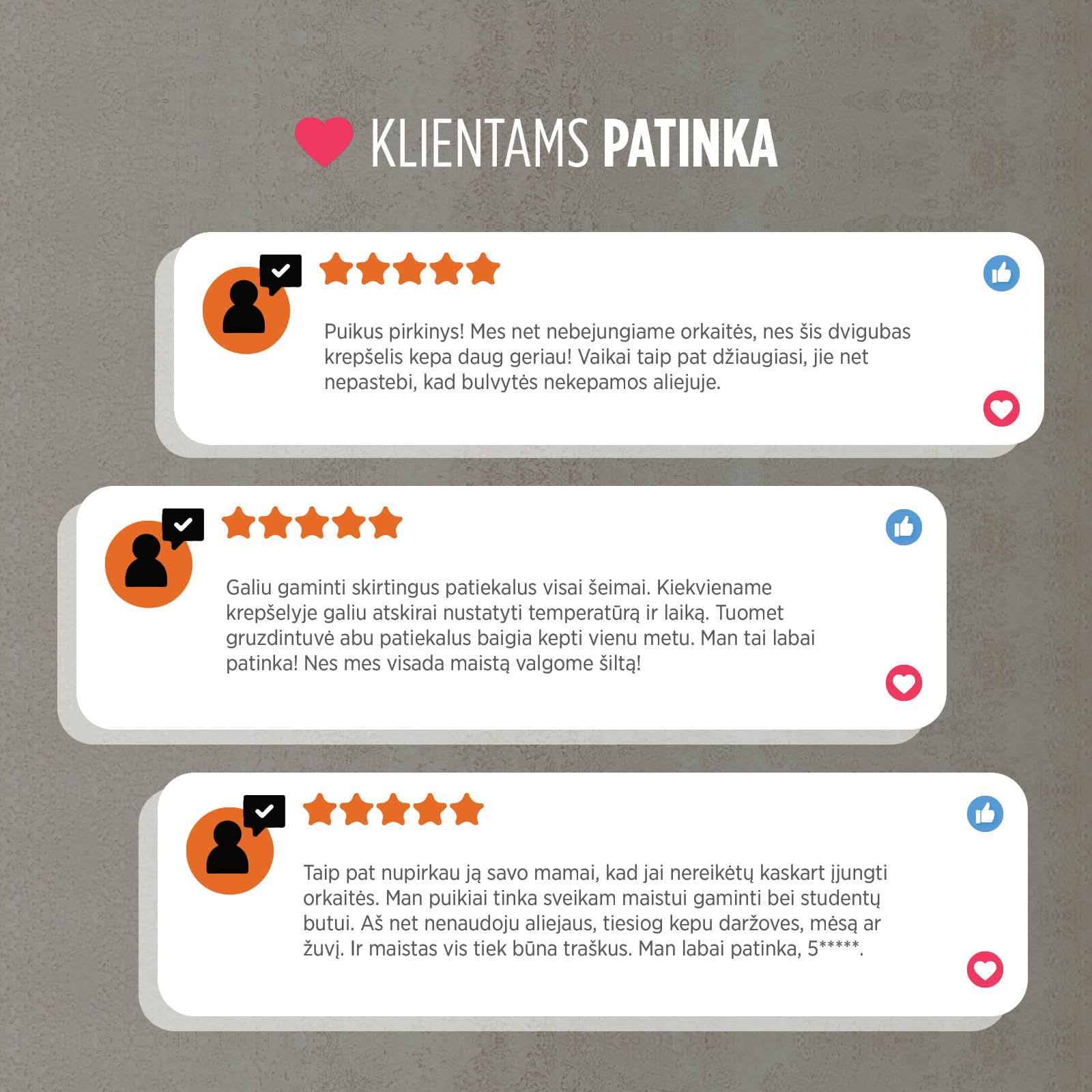 - Nesvylanti krepšelių danga, kad būtų dar lengviau kepti ir valyti.