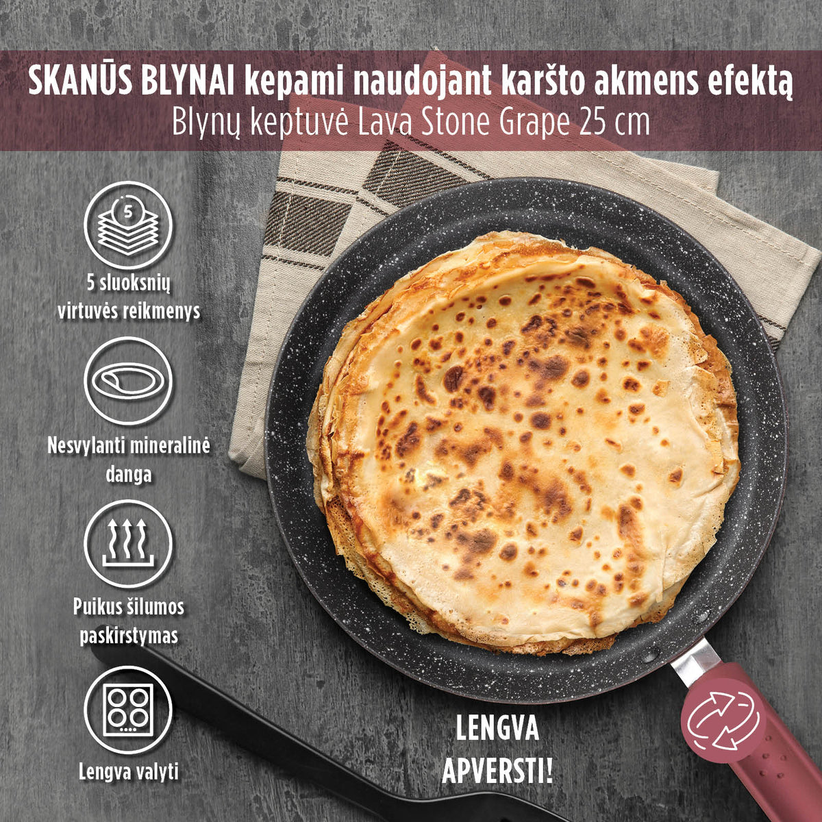 Lava Stone Grape blynų keptuvėje galima kepti gardžiausius ir puriausius blynus, kiaušinius, mėsainius ar tortilijas. Dėl naujoviškos šiurkščios nepridegančios vulkaninio akmens išvaizdos dangos galite gaminti ir kepti natūraliai, naudodami mažiau riebalų. Tinka visoms kaitlentėms, įskaitant indukcines. Dėl nepridegančios dangos, kuri padengta ir išorinėje puodų ir keptuvių pusėje, valyti dar lengviau. Visi Lava Stone Grape asortimento aukščiausios kokybės puodai ir keptuvės yra pagaminti iš daugiasluoksnės medžiagos, kuri užtikrins ilgą indų tarnavimo laiką ir ilgaamžiškumą.