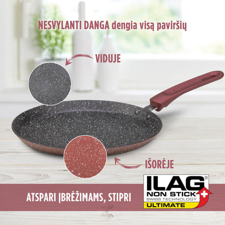 Norite, kad omletai ir blyneliai priliptų prie keptuvės paviršiaus? Šveicarijoje sukurtos nelimpančios mineralinės dangos ILAG Granistone sudėtyje yra šiurkščių, vulkaninės kilmės mineralinių dalelių, neleidžiančių maistui prilipti prie keptuvės paviršiaus. Dėl nepridegančios dangos, kuri padengta ir išorinėje puodų ir keptuvių pusėje, valyti dar lengviau.