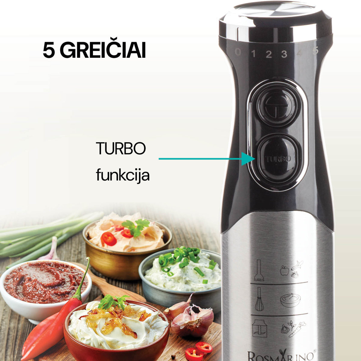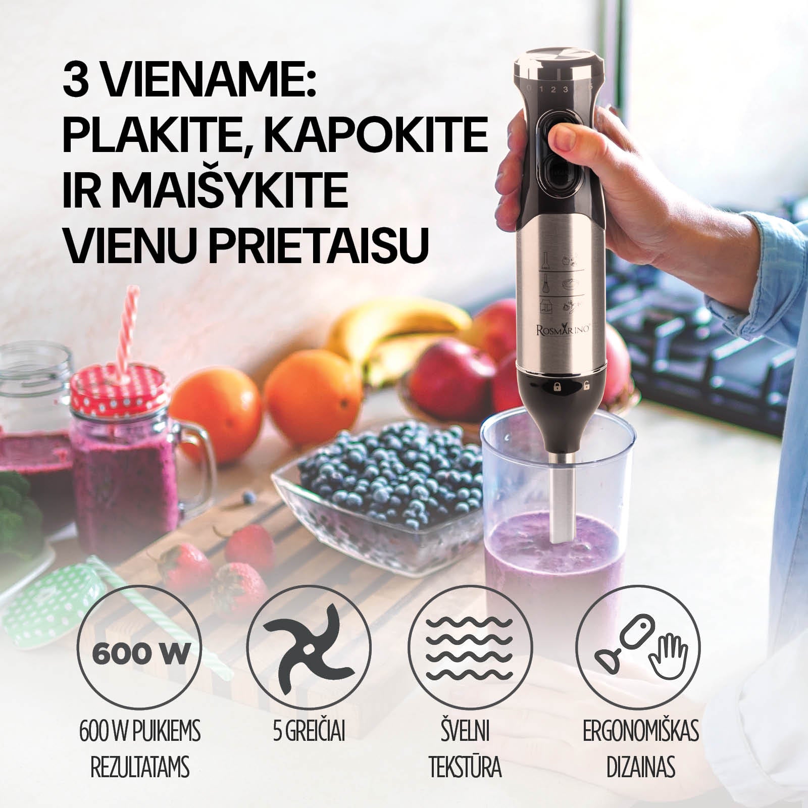 - 3-viename: Supjaustykite, susmulkinkite ir sumaišykite 1 prietaisu. 5 greičiai + turbo funkcija leidžia išgauti skirtingą patiekalų tekstūrą.