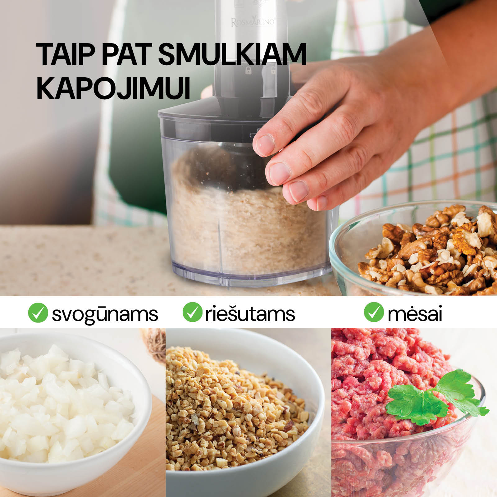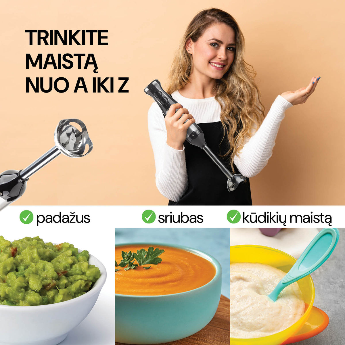 Su pridedamais priedais galite paruošti tikrai įvairių patiekalų. Sutrinkite sriubas ir padažus, išplakite grietinėlę arba susmulkinkite svogūnus. Nuo šiol jums nebereikia 3 skirtingų prietaisų, nes viską galite paruošti 1 veiksmu.